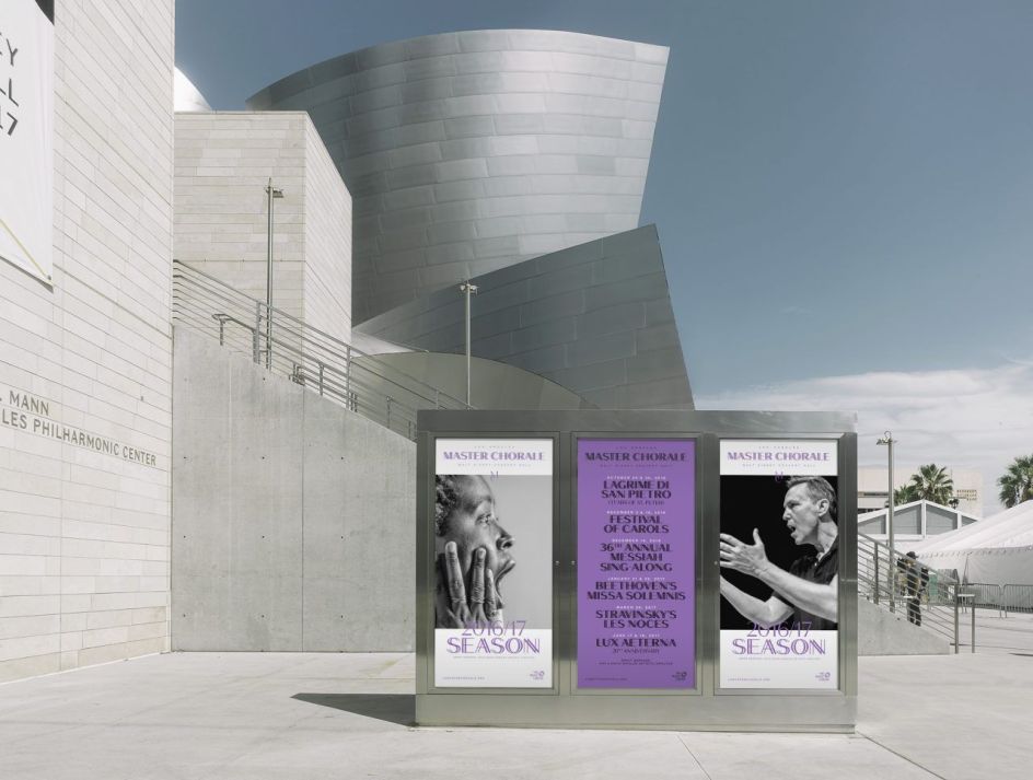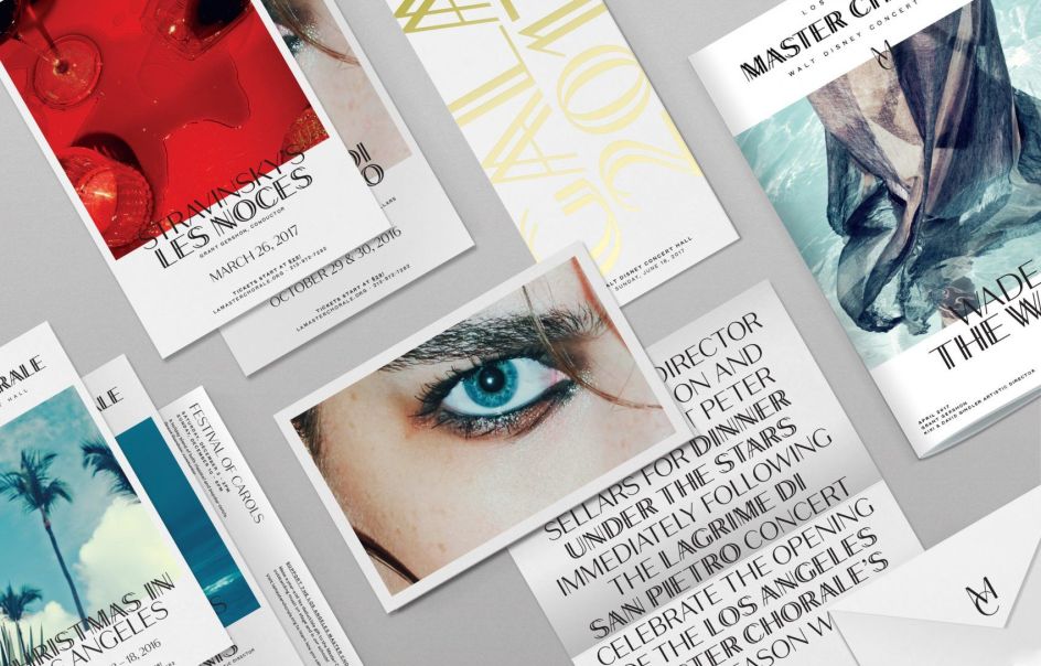 As part of this, the designers deliberately eschewed cliched classical music tropes such as scripty serif fonts and tasteful photography, instead employing a clean serif font and moveable typographic logo mark that feel modern, rather than stuffy. They also wanted the chorus to seem more entrenched with LA as a whole, rather than just the stunning Frank Gehry-designed Walt Disney Concert Hall that houses it.