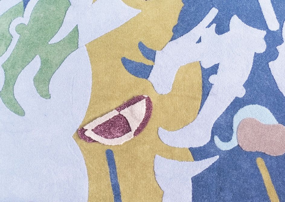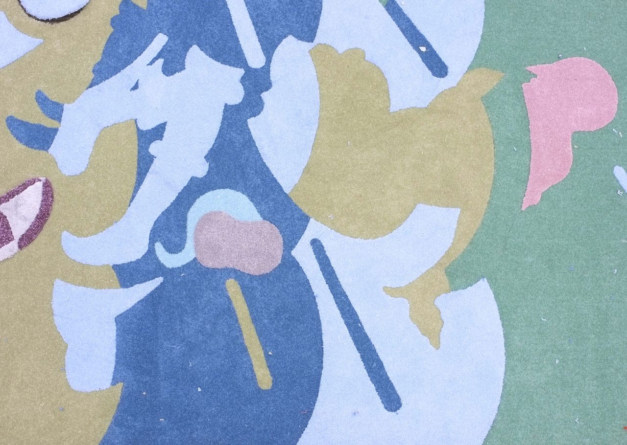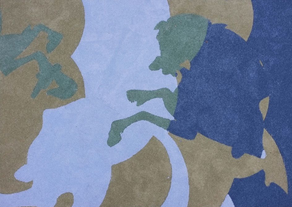 It does this through covering her entire space in a carpet created through hand-cut sections of green, pink and blue material that references the 15th century Siena Cathedral’s marble ‘intarsio’ floor, which once showed Biblical battle scenes before time and feet eroded the image and transformed it into a more abstract composition.