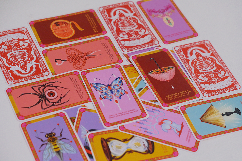 The card designs incorporate Chinese knots along with a variety of symbols from Chinese culture, while the imagery itself reinterprets traditional idioms, deconstructing how they reflect on women's roles in society, for example, expectations around childbirth.