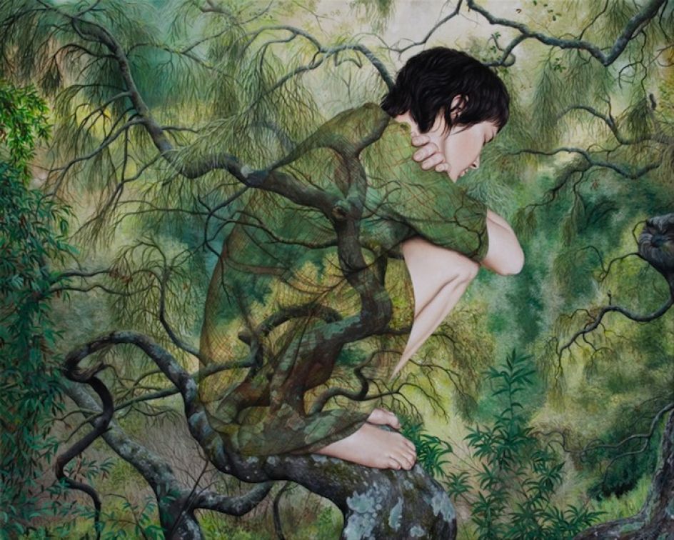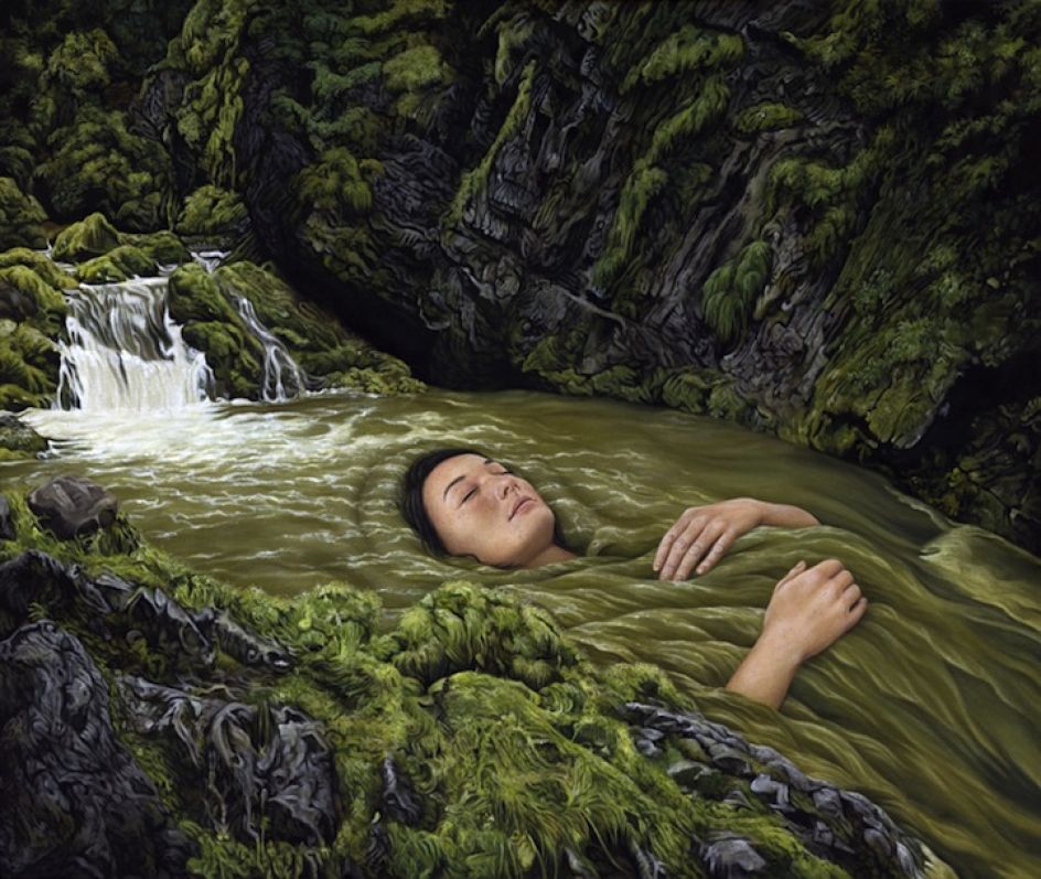 Finding inspiration in Japanese art and Scandinavian landscapes, her acrylic paintings are filled with interesting terrains that seem to cloak her subjects.