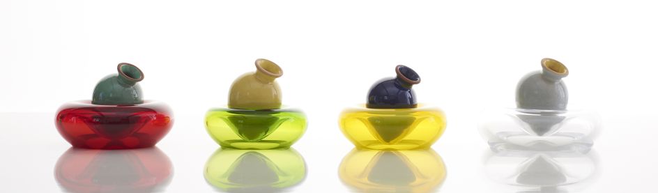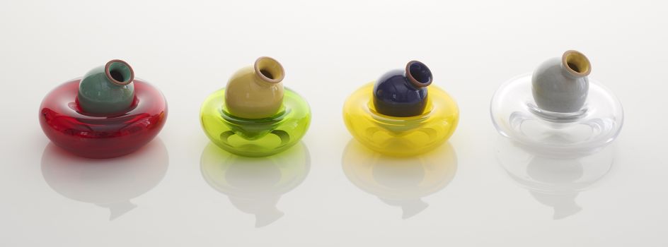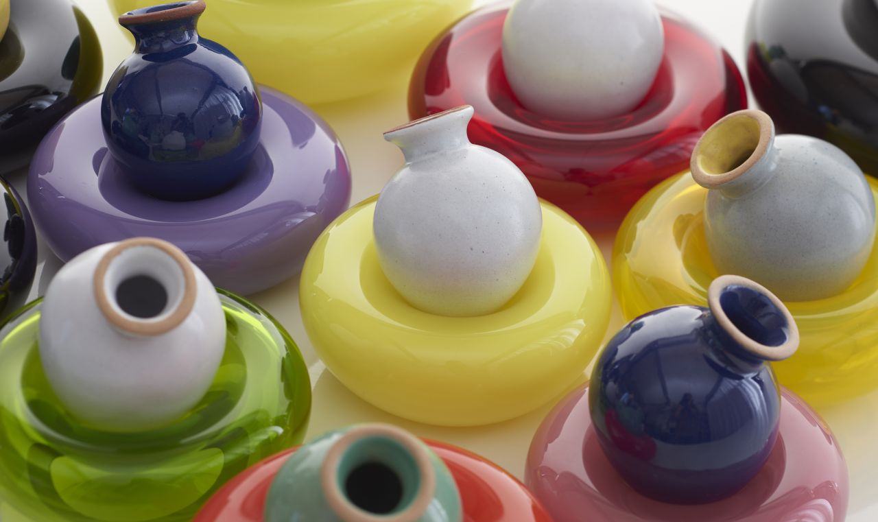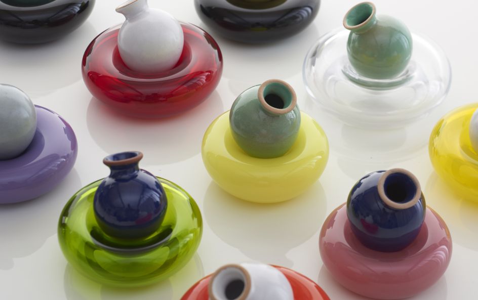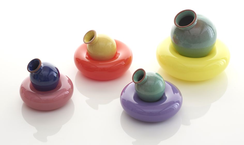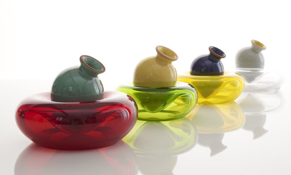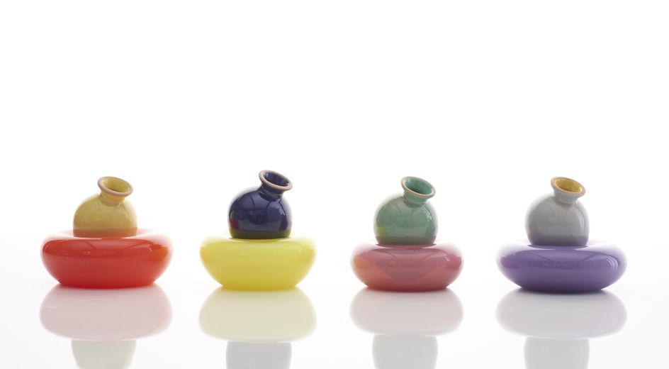 "The Amphorae are made of a particular hue of red terracotta developed by the studio to resemble low-fire Mediterranean red clays. They are glazed with maiolica glazes, adapted from various pre-existing glaze recipes by adding colourful glaze stains, to achieve an opaque chromatic palette."