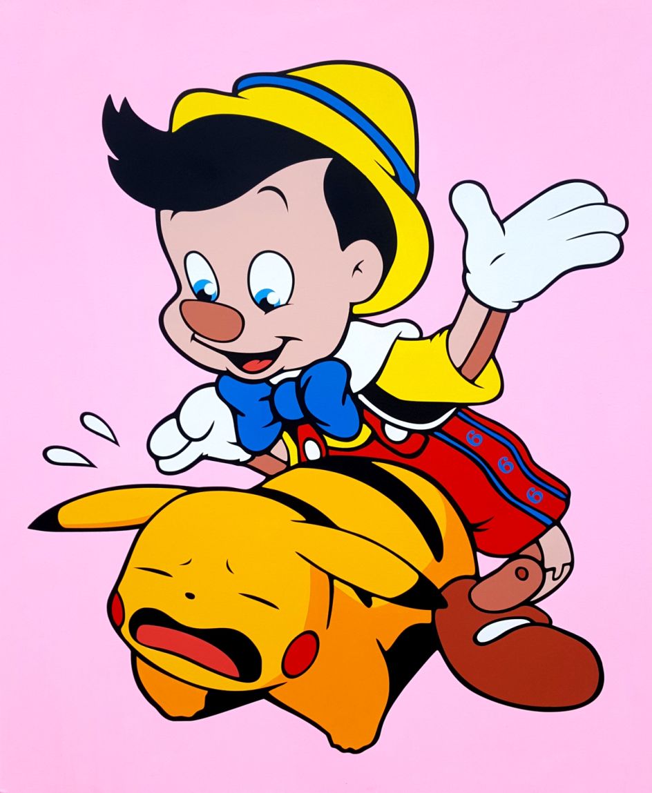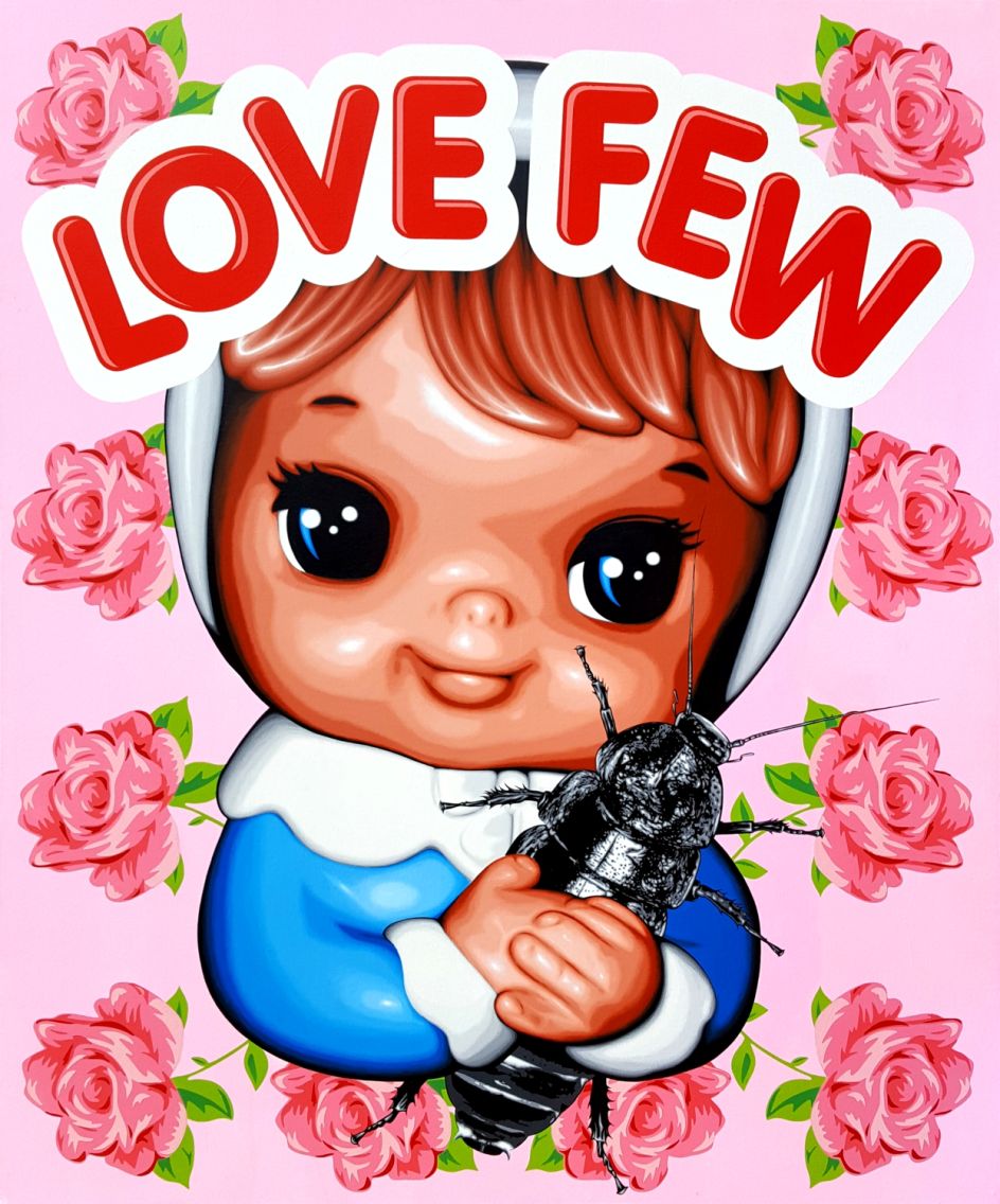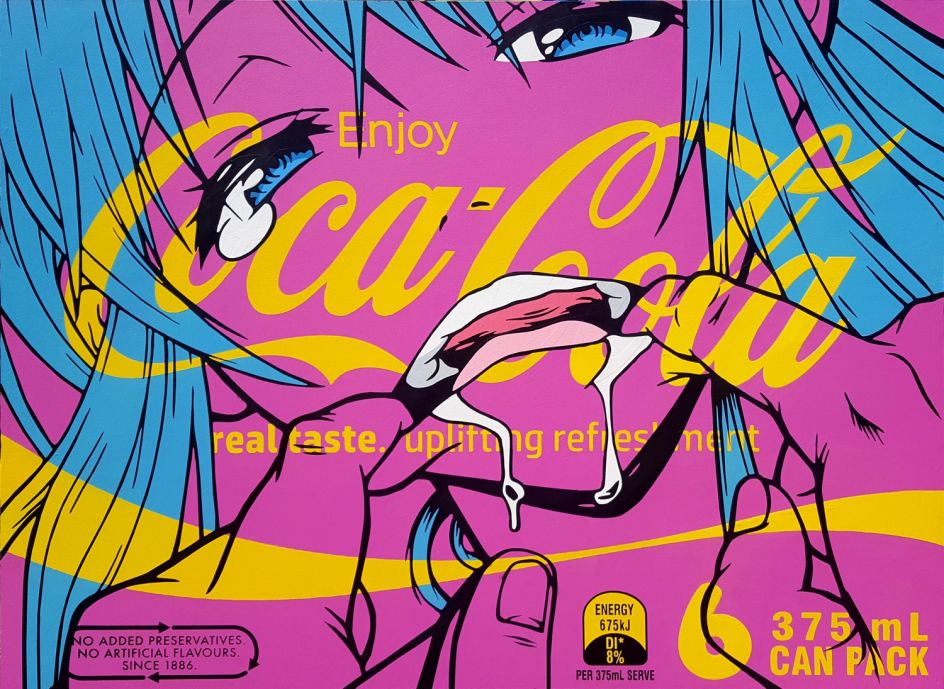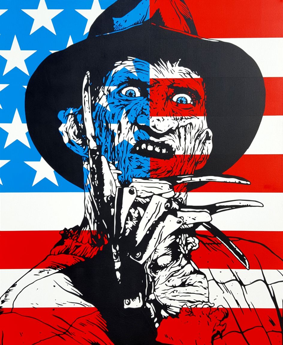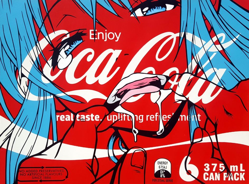 By subverting mainstream iconography from the worlds of advertising, entertainment and politics, he creates a visual framework that is bold, confronting and often controversial. His imagery often shows hentai inspired girls, highlighting the hyper-sexualisation which overwhelms modern advertising. Children's characters appear sexualised, Freddy Krueger reigns large over an American flag, In SKIP A.D.’ Frost welcomes the viewer into his disturbing American Dream.
