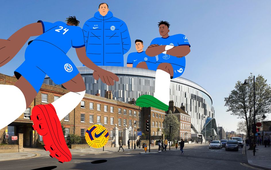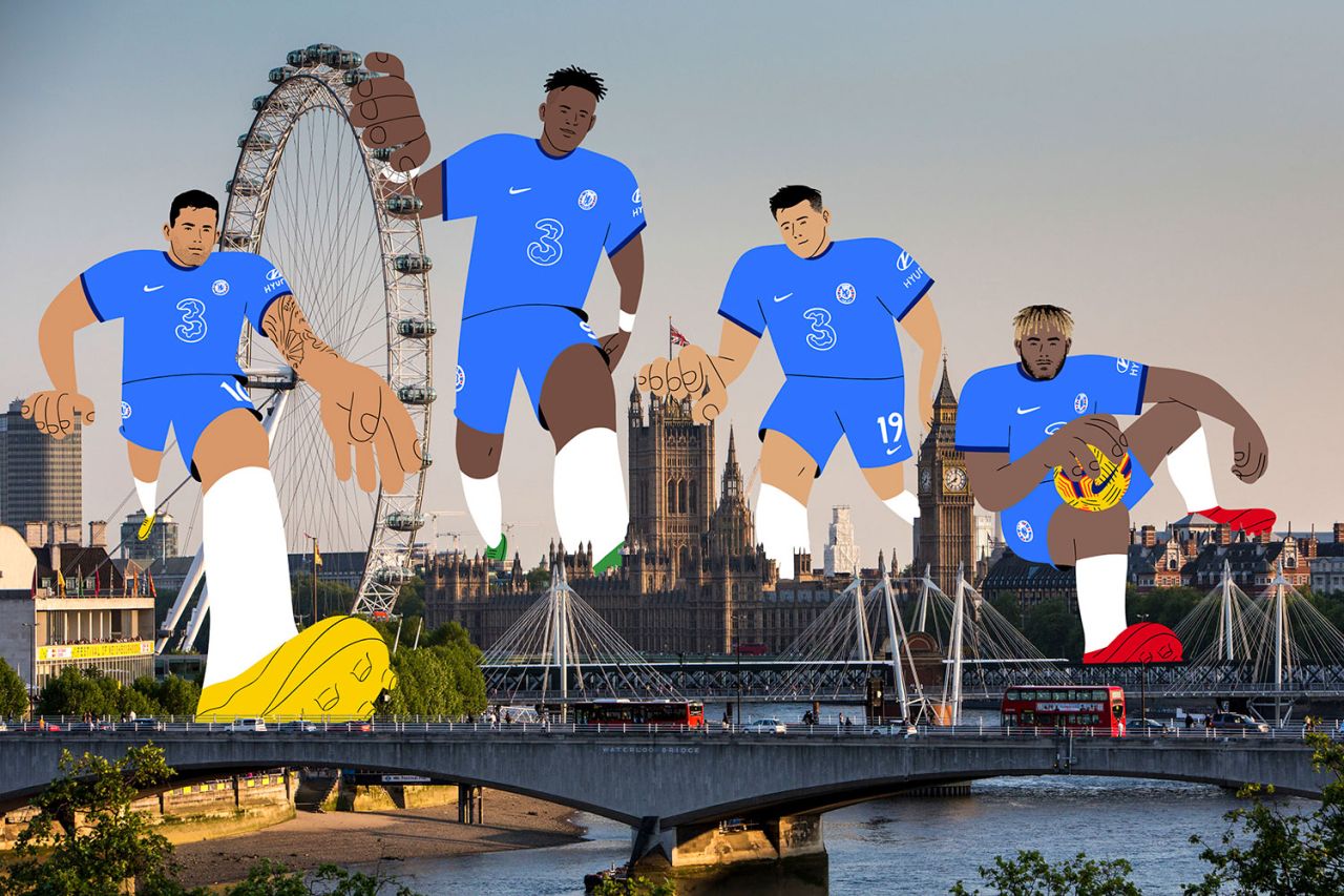 Produced were three illustrations depicting players like Tammy Abraham as giants proudly roaming London and stadiums like Stamford Bridge and a short interview with Alva about the process behind the pics. Creating them involved Alva meeting the team over Zoom to discuss the project. Chelsea and Copa90 then detailed the brief and decided on the photographs to use, after which Alva made a few roughs of how the players could be positioned amongst sights like London's South Bank skyline.