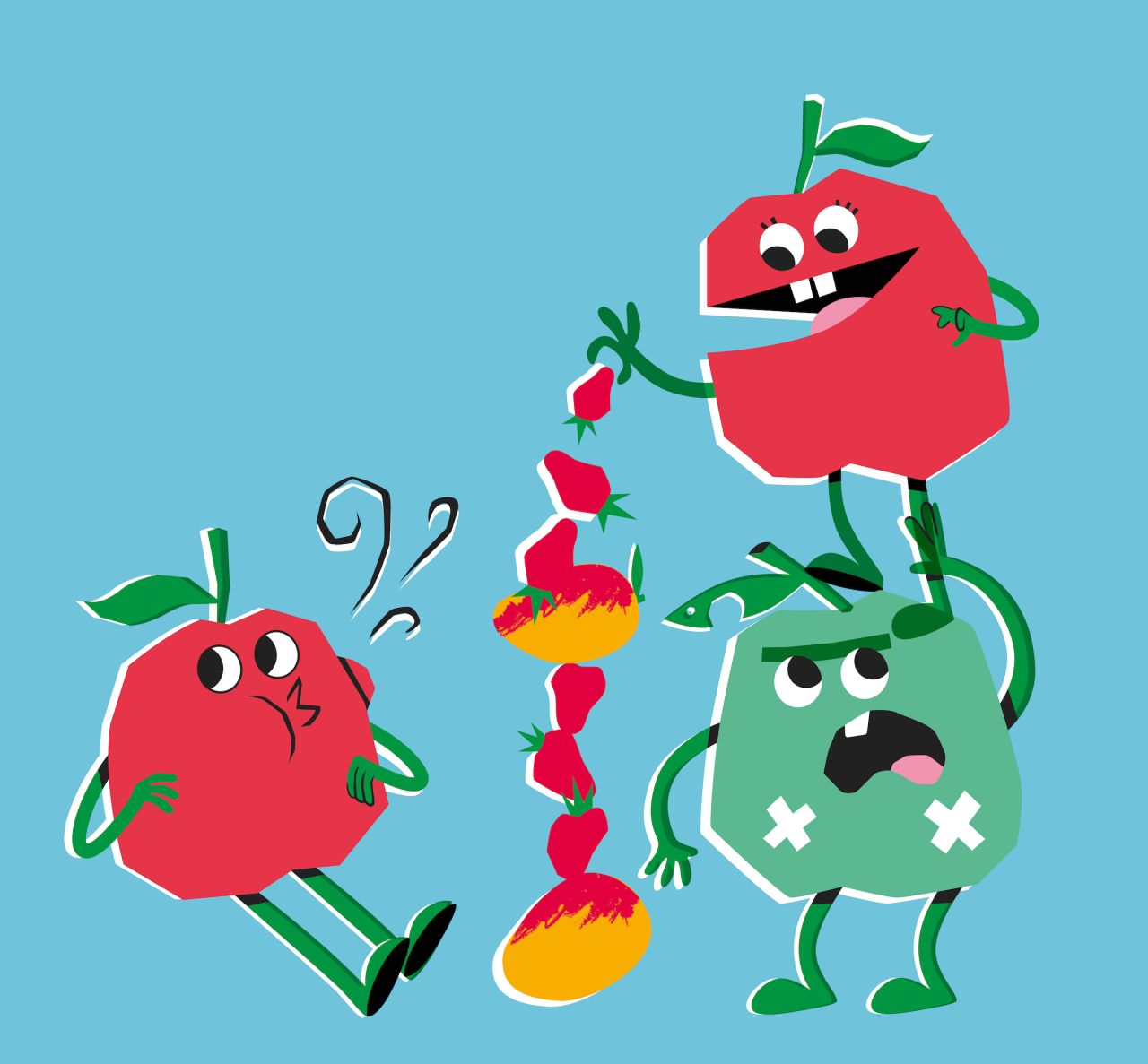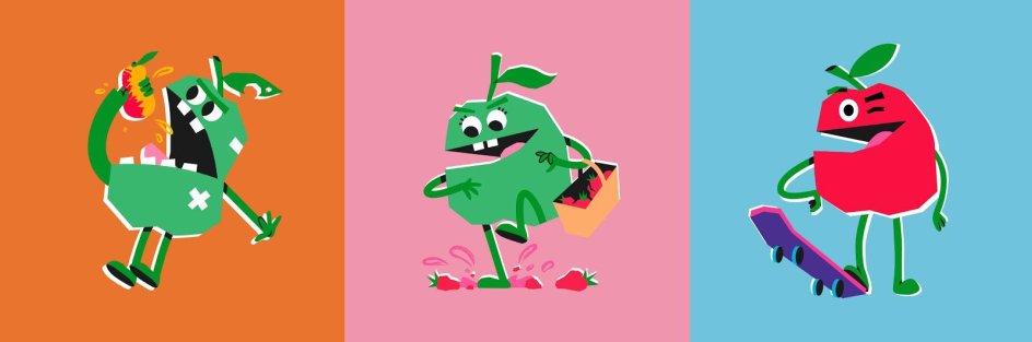 The brand centres around three fruit characters the agency named Blemmy, Bumps and—somewhat incongruously—Biggie Smalls. Illustrator Nathan Joyce was commissioned to bring them to life, drawing them as cheeky, brightly coloured little anthropomorphised apples. The agency sheds some light on their unusual names: "Bumps likes his pip-hop beats, Biggie Smalls runs his own disco; the Ministry of Round and Blemmy was raised by her Granny Smith to be just a little odd."