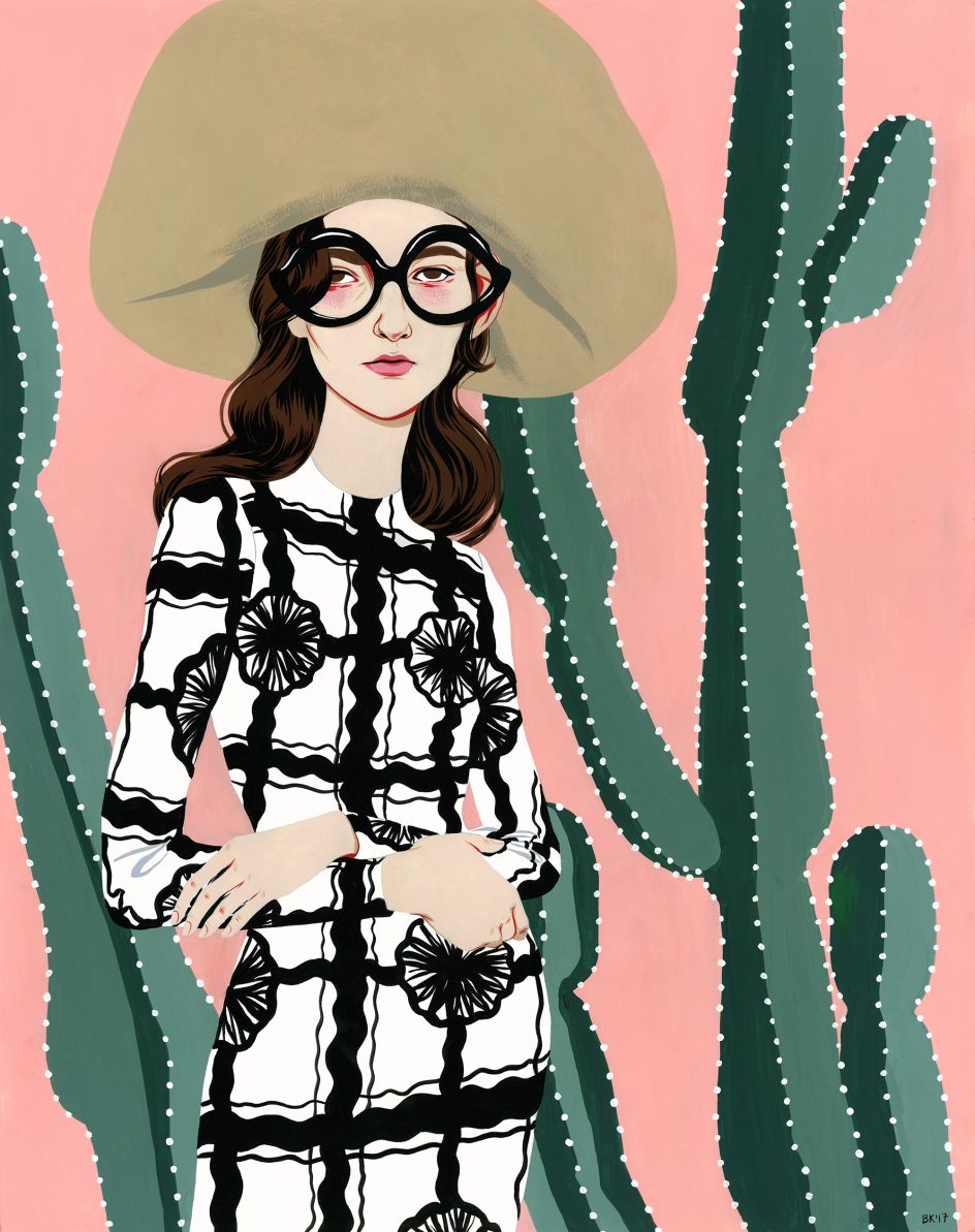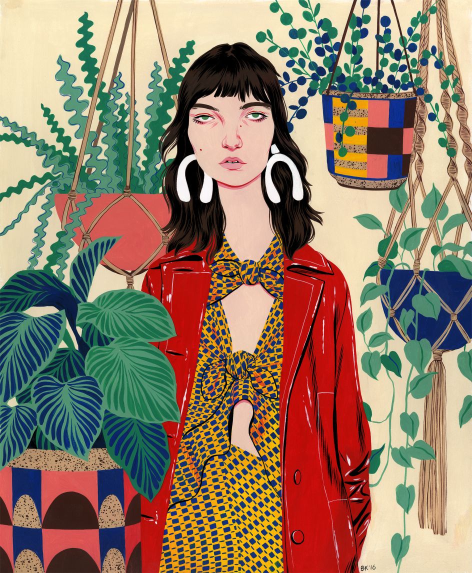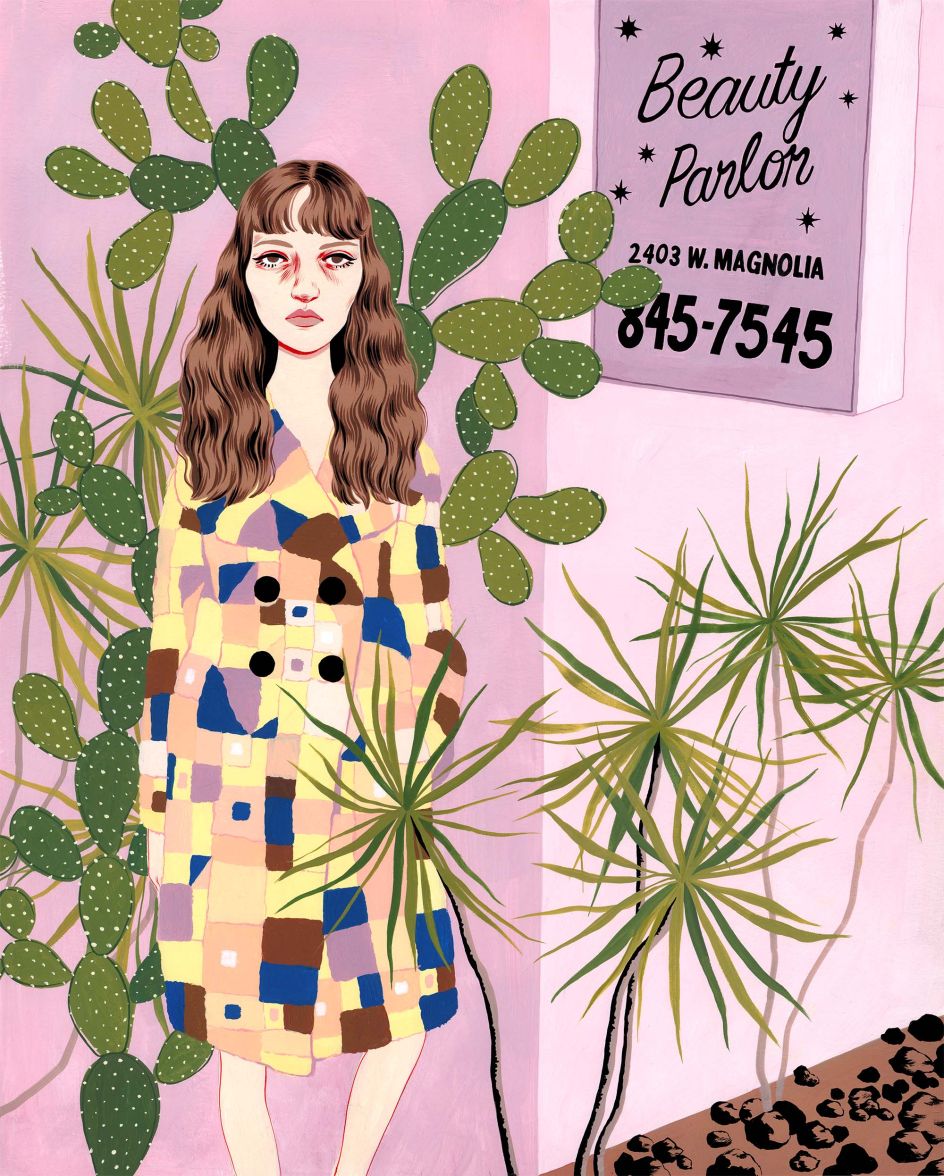 Based in Los Angeles, the artist is inspired by strong women, fashion, Googie architecture and a love of strong colours, print and plants.