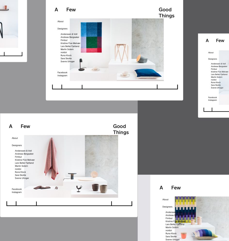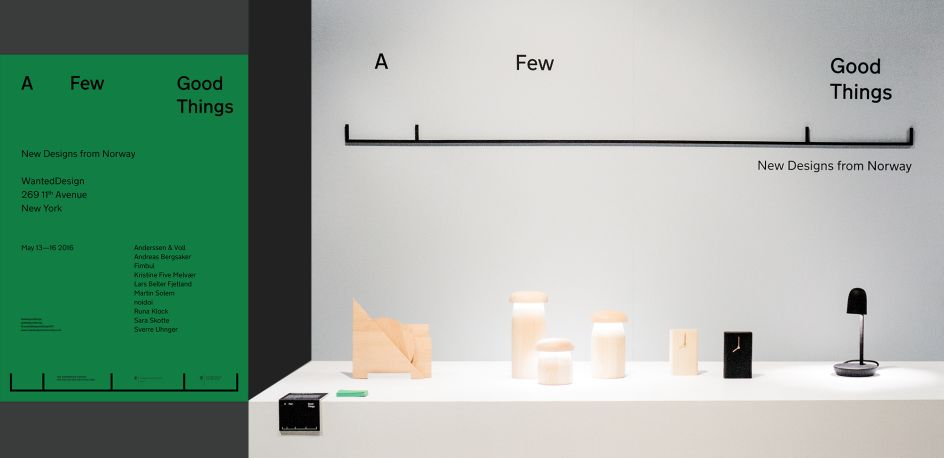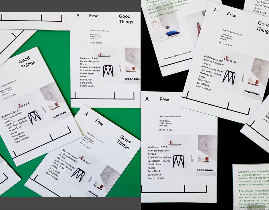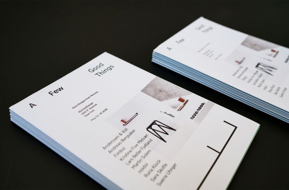 A Few Good Things, which took place in mid-2016, was a showcase of ten Norwegian designers as part of New York's Wanted Design show NYC x DESIGN. The identity therefore required a pared back approach, to let the work do the talking and also due to the vast number of applications, from show graphics, to a website, to catalogues and stationery. The designs for the business cards show the adaptability of the simple graphic that features across these touchpoints, a measuring tape-like line with nodes that vary in their distance from one another across different team members' cards.