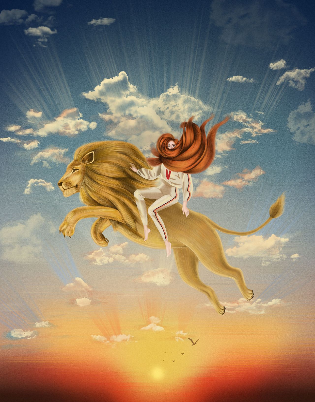 Meanwhile, the iconic illustration of Victoria riding a lion is a tribute to the CEO's Leo star sign. It's one of three images that depict Victoria in a different setting, each relating to a different part of her birth chart and her background as an artist. "We decided to do three images so the three main studios could each have a different concept with only the textual logo tying them together," explains Leyda.