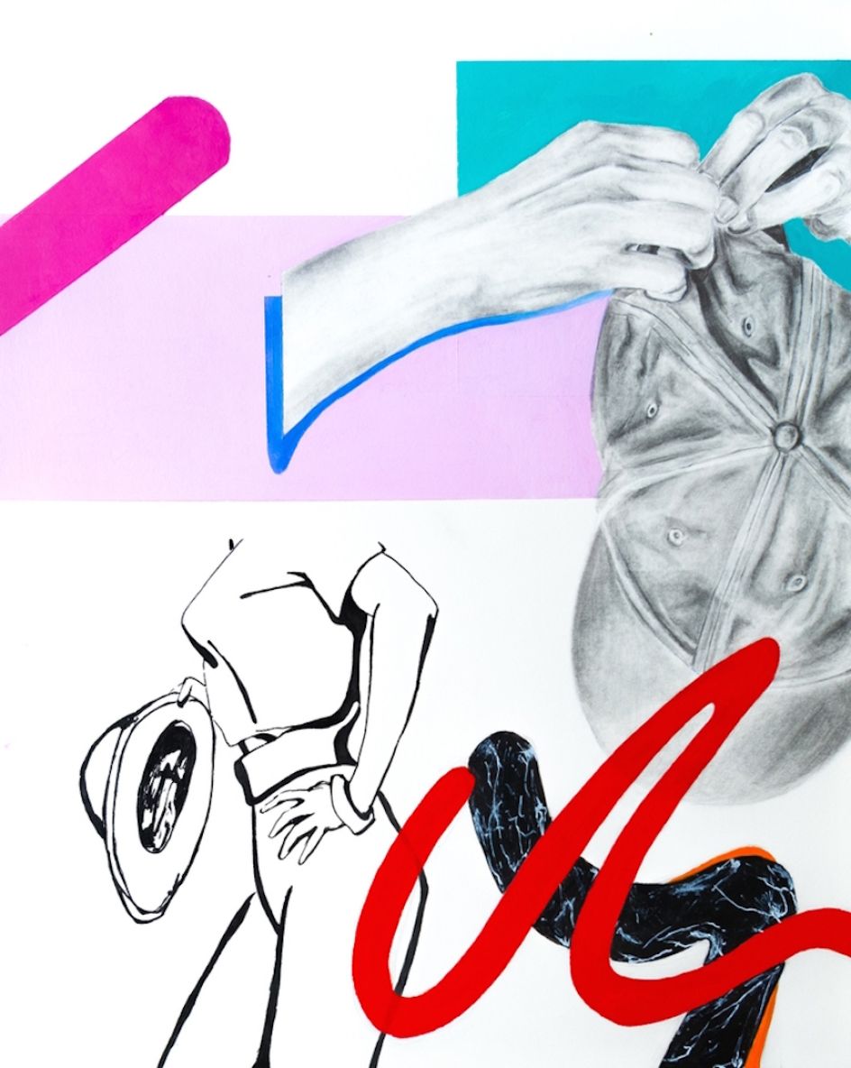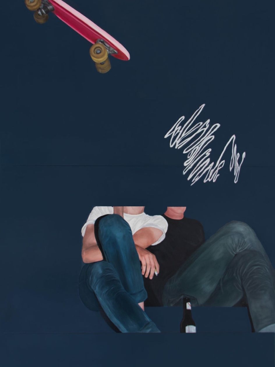 Using a collage effect, and bold colour-blocking, Miller layers multiple objects to create individual stories for each painting. Whether that be teenage boys hanging around doing nothing much at all, or girls blowing strands of pink bubblegum. The subject's faces are almost always obscured, which allows the viewer to apply elements of their own memories of lazy summer days to the scenes.