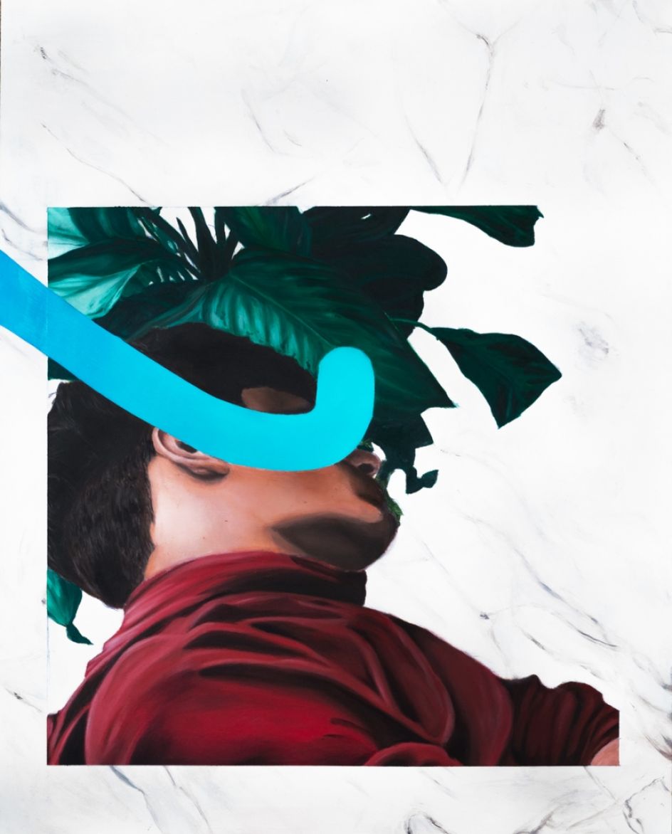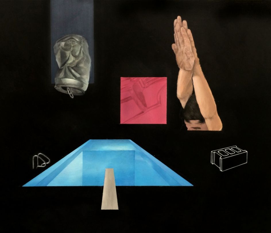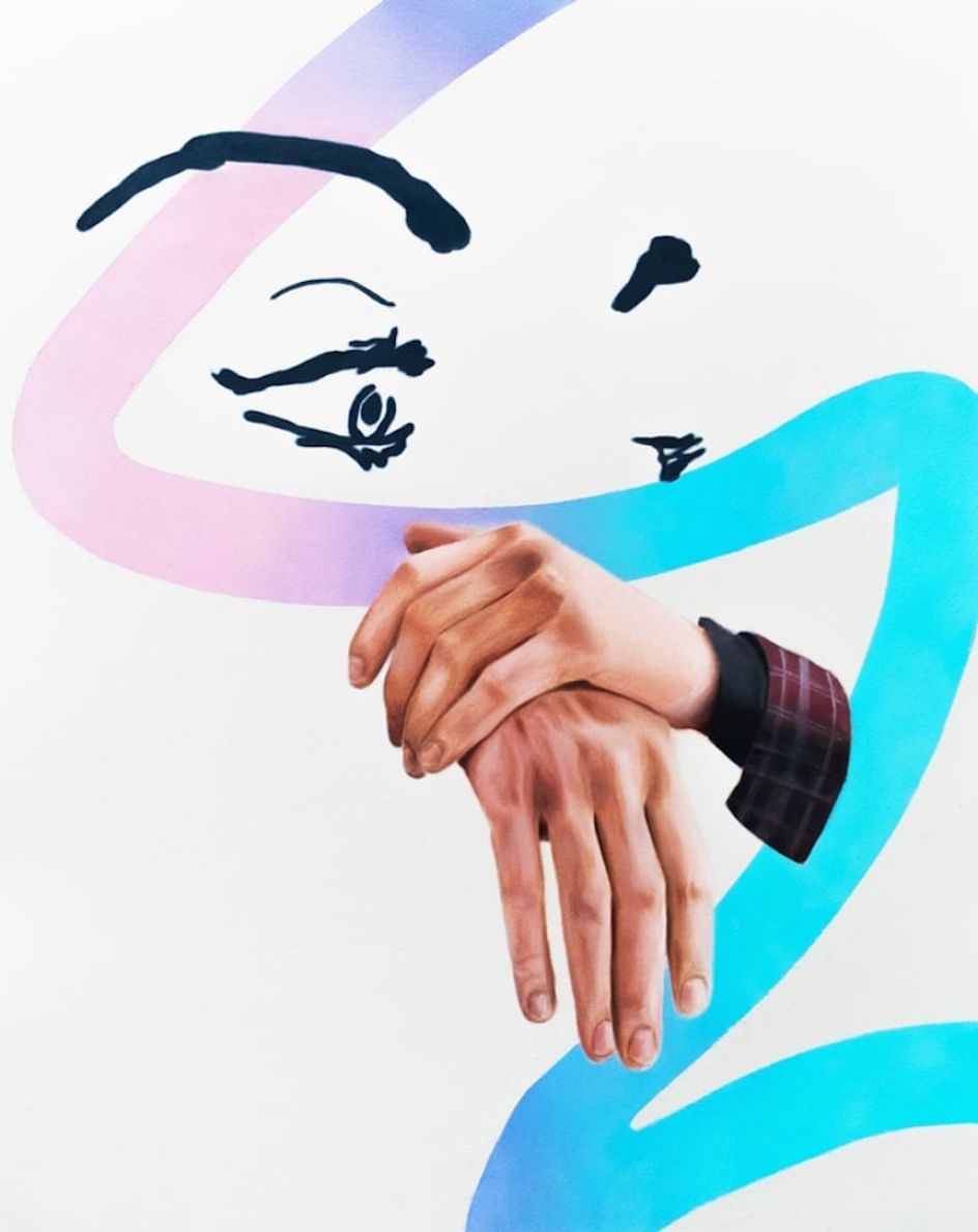 Hands tend to play a central role in the paintings, alongside predominant pop cultural references from the sixties and eighties. Some works display a nod to Hockney's A Bigger Splash, whilst others incorporate 'still life', favoured by artists operating under the pop artist movement.