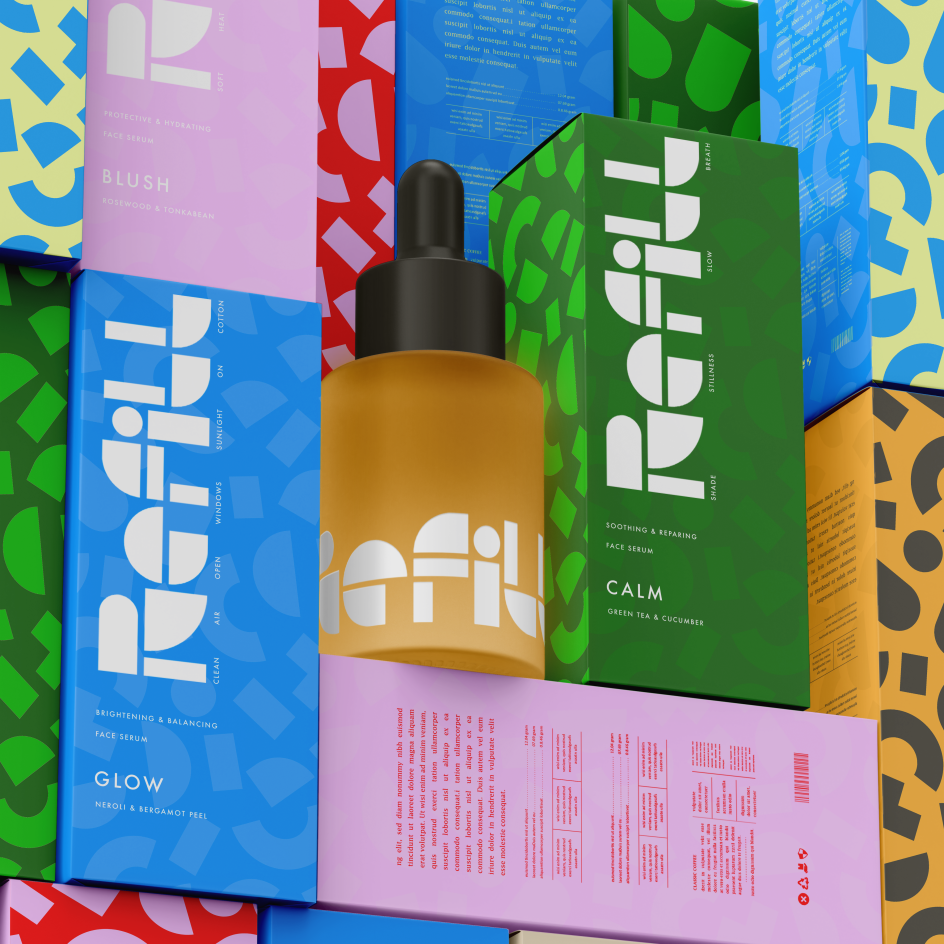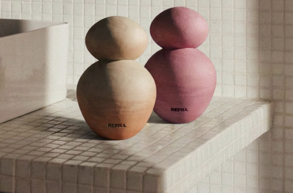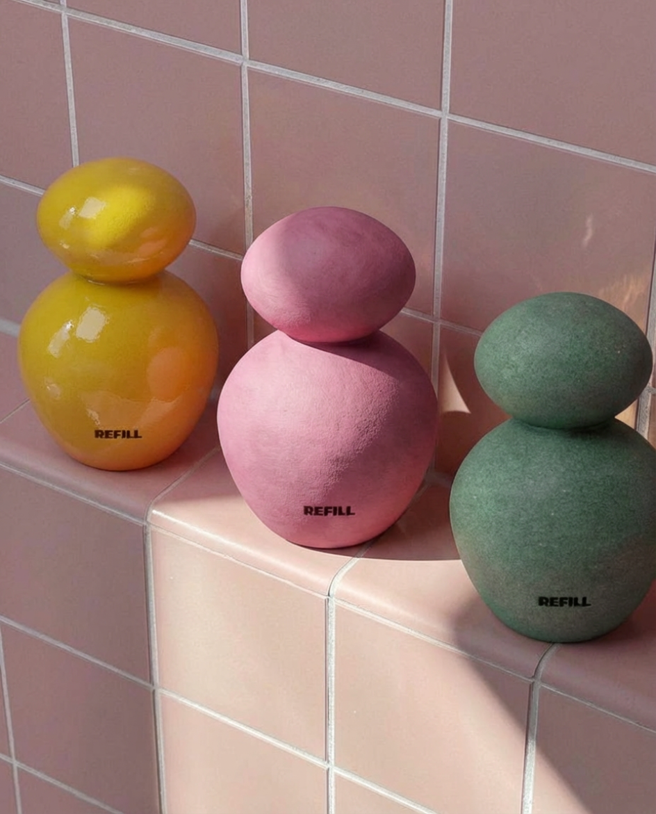 Kate questioned what refillable packaging could even be. Instead of bottles, she reimagined REFILL as a ceramic vase; an object designed to be kept and valued indefinitely. It was modelled in Cinema 4D, inspired by Helle Mardahl's signature Bon Bon designs.