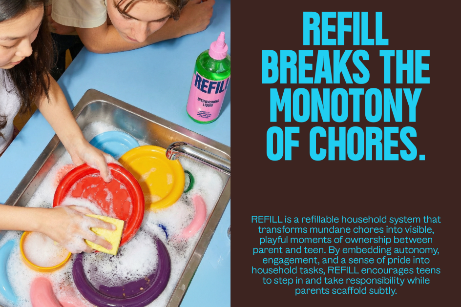 "REFILL reframes chores not as enforced tasks, but as visible moments of ownership," Sunnie explains. Her vibrant design is based on a chilli bottle form: an unexpected but familiar choice that breaks visual norms whilst remaining functional. The sharp colour palette deliberately contrasts typical "eco" aesthetics. Rather than soft greens or beige, the colours are vivid and assertive.