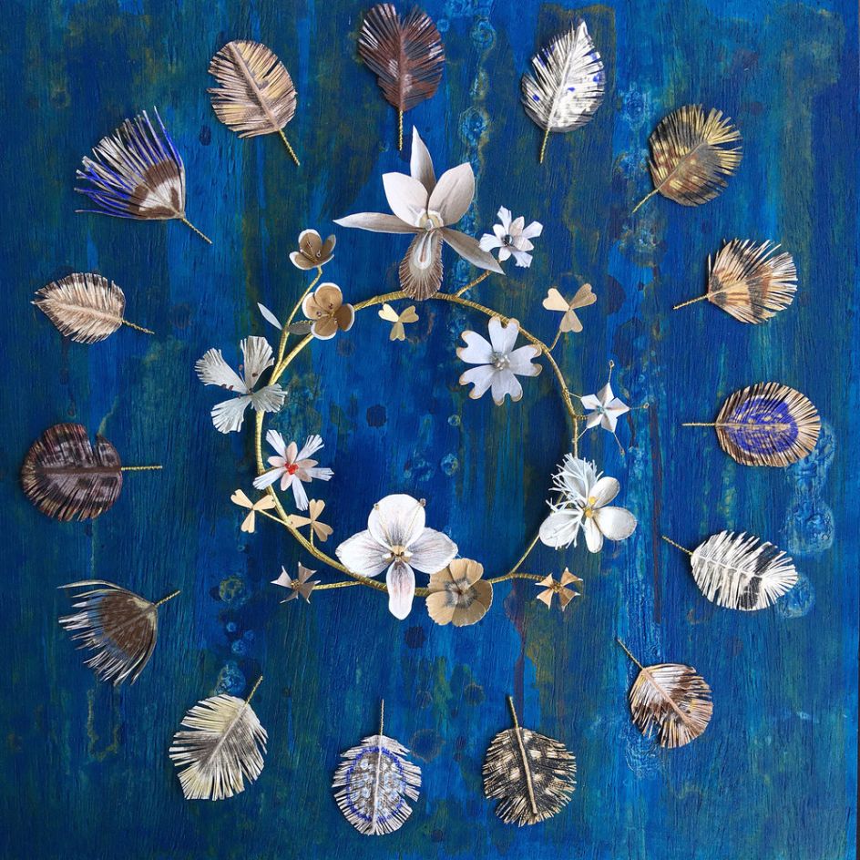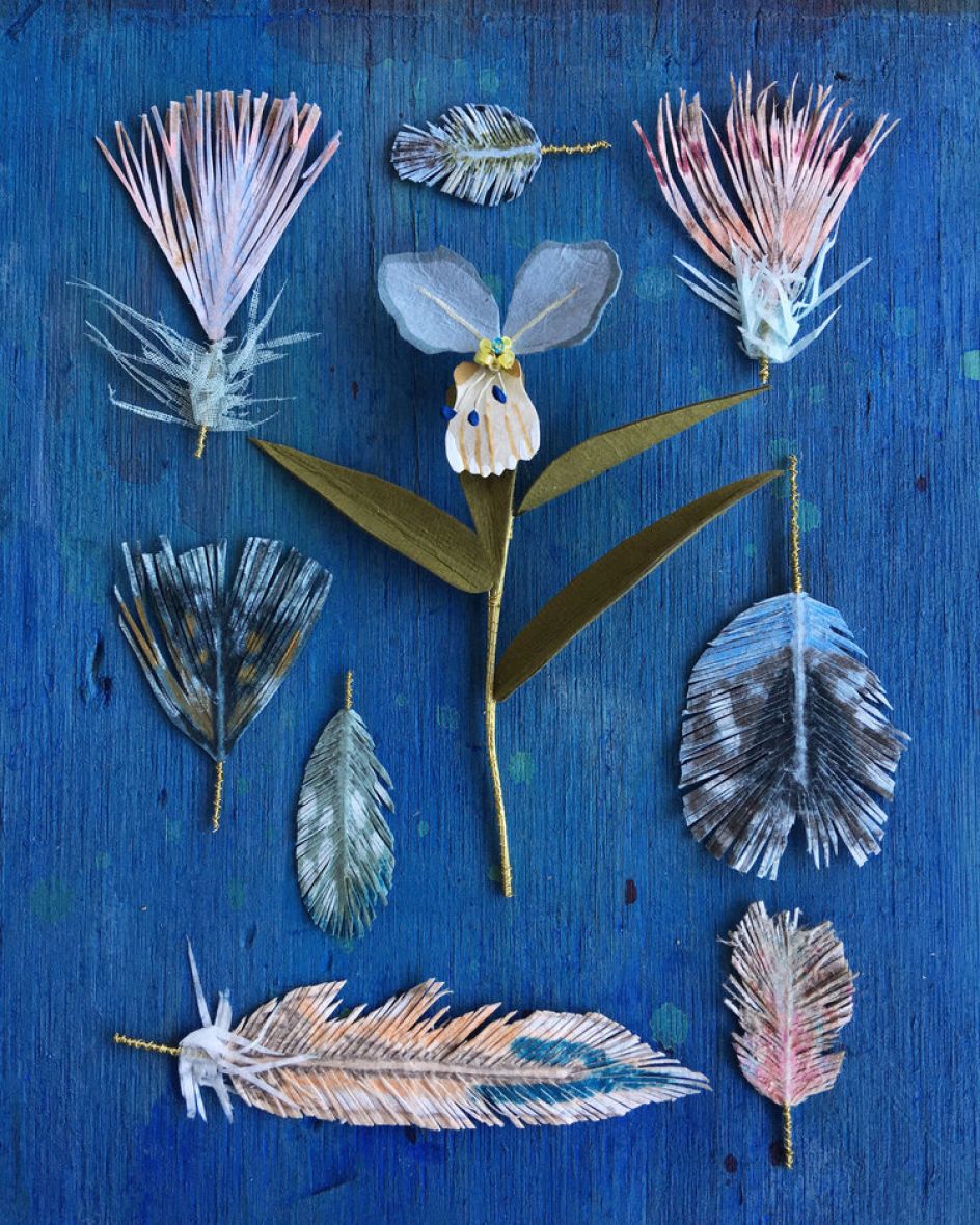 Ann manipulates paper and wire, using drawing and cutting with sharp embroidery scissors. She then applies fine cuts to achieve realistic yet fanciful butterfly wings, feathers, and flowers. These sculpted creations are then hand-sewn on to wool and velvet backgrounds before being framed in vintage frame stock. The work is delicate and direct with a nod to craftsmanship from decades ago.