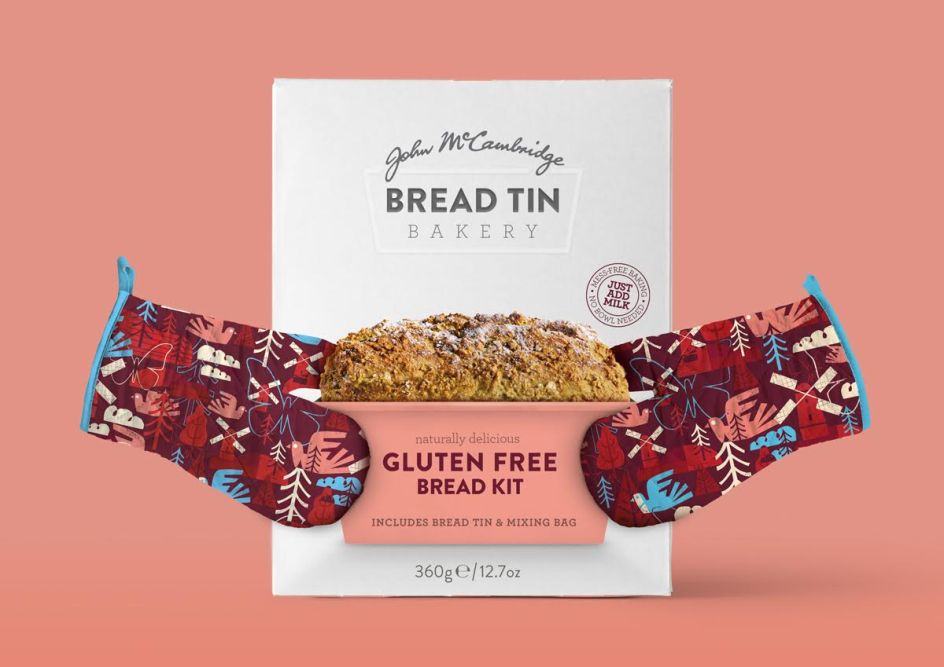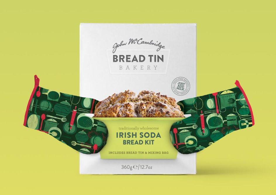 "To emphasise the bake-at-home aspect of the brand, each different oven glove design makes reference to the McCambridge story: the classic Irish Soda Bread Mix features an Irish kitchen top with vintage family memorabilia, the White Bread Mix box depicts the Irish coastline and the history of importing goods from around the world, and the Gluten Free mix uses illustrations of the Irish countryside to hint at the lightness of the Gluten free loaf. The kits come complete with bread tins included (hence the name) and a unique no-mess mixing bag; all you need is your oven gloves!"