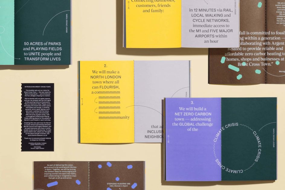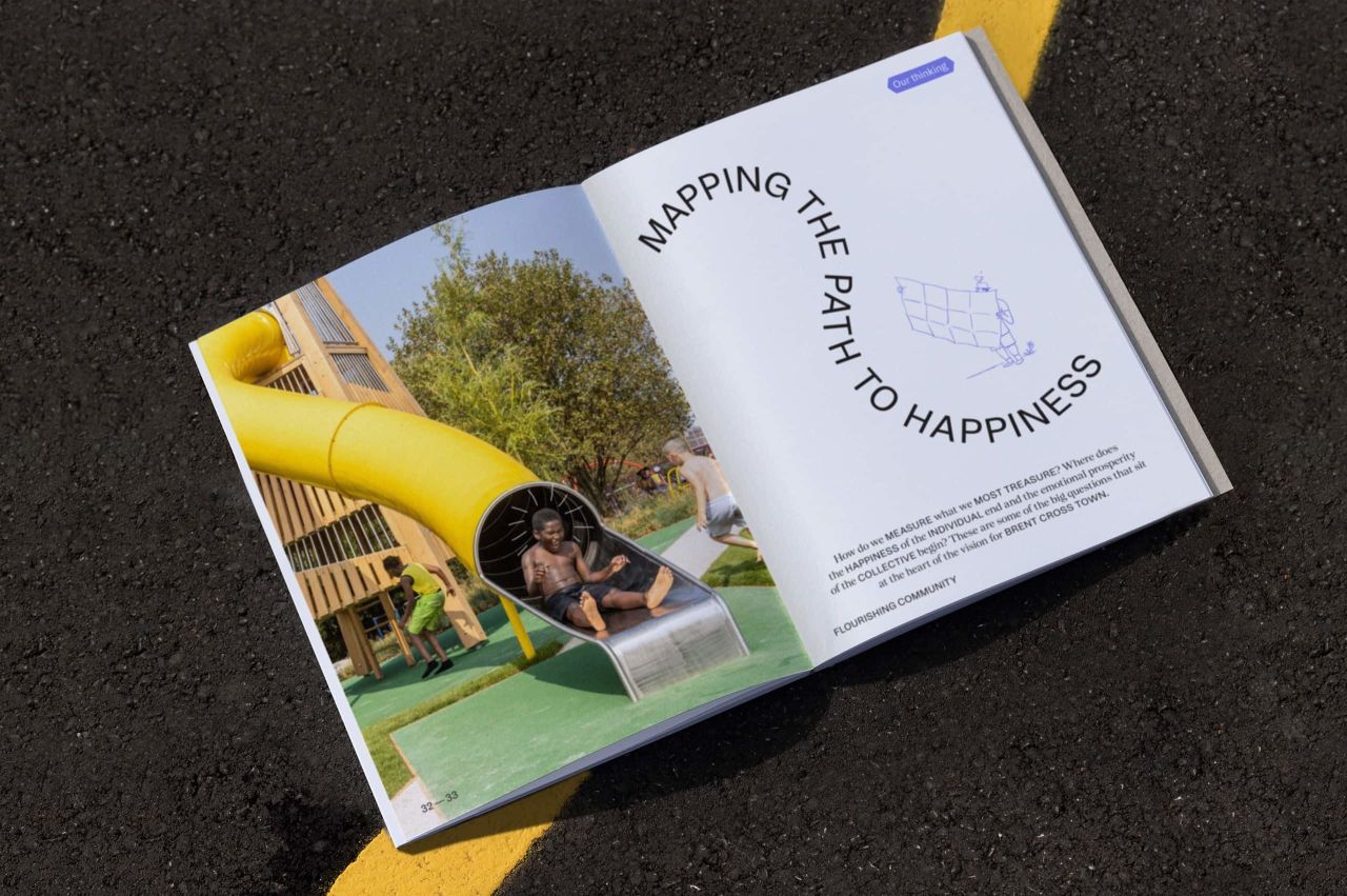 "Play inspired the use of the swirling, circling, underlining language of annotations. It also informed our colour palette, our choice of photography and the evolution of the Brent Cross Town marque: an x that marks the spot on the treasure map of North London and evokes colliding crossroads where a community comes together to play."