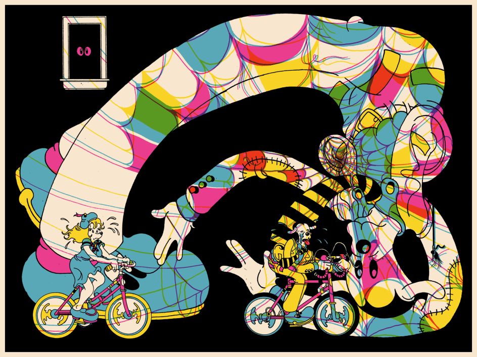 In Bicycle Day, Blomerth guides us through the story of Hofmann's discovery, winding through time, with locations incorporating almost recognisable Disney-like characters in collage, digital overlays and hand-drawn pen on paper.