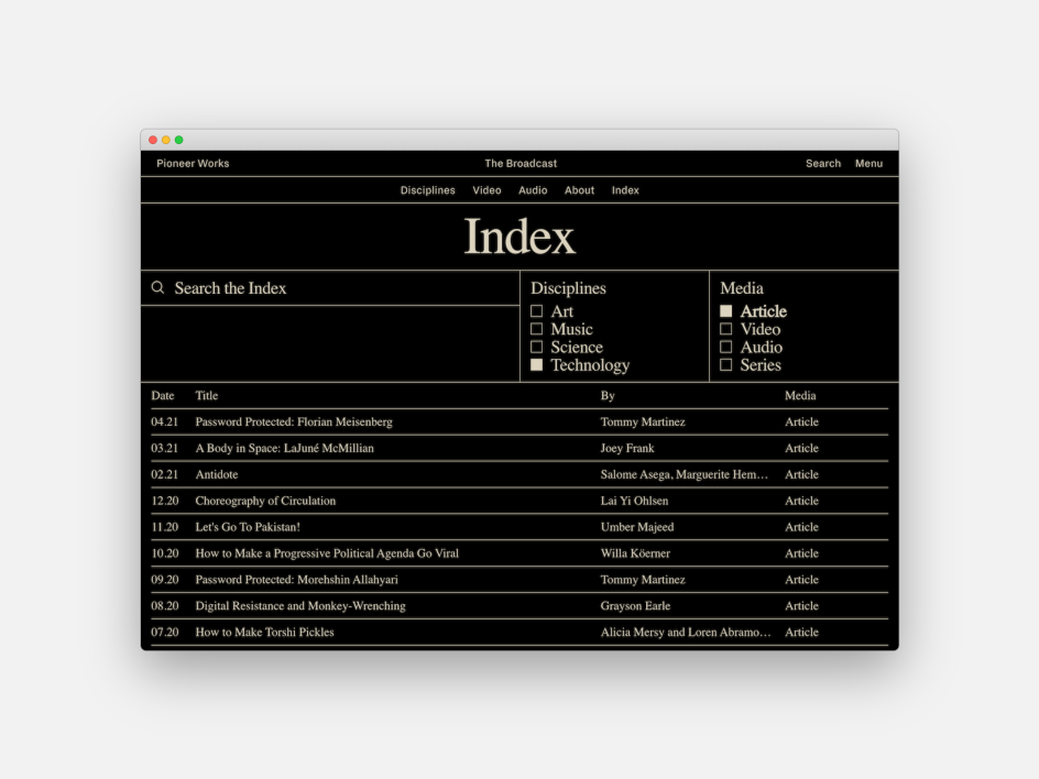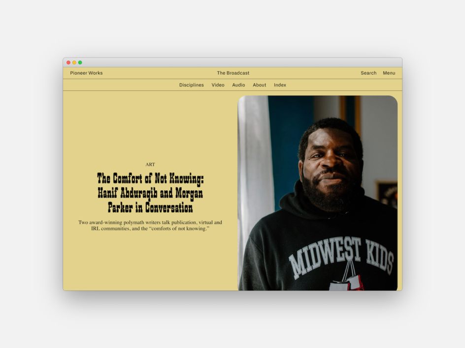 Brooklyn-based interdisciplinary nonprofit Pioneer Works has created and designed Broadcast, a new digital magazine that launched earlier this month.