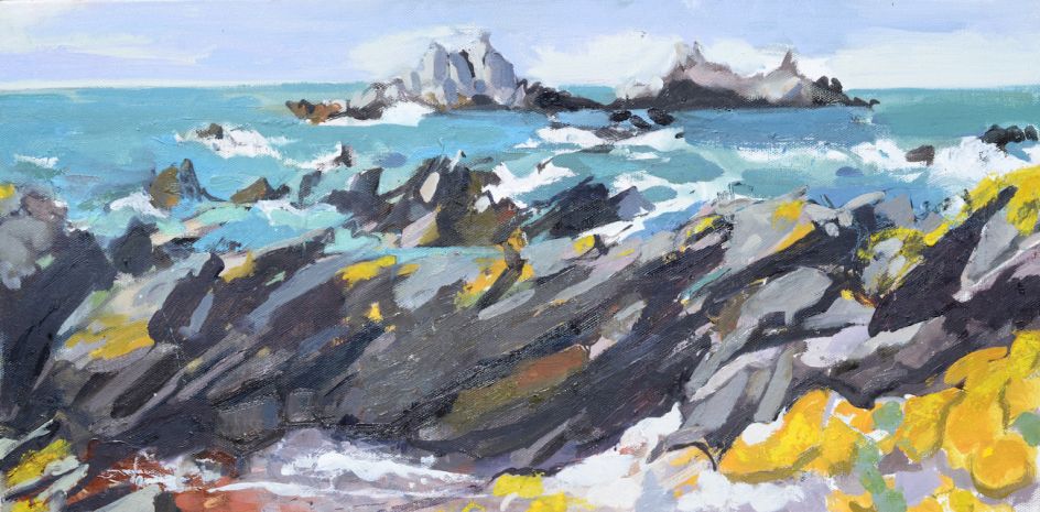 Practically cropped to abstraction with the sea often occupying fully half the composition, Caroline's rocky coastline paintings appear alternatively angry, aggressive, unyeilding, locked in battle with a feisty sea or calm and tranquil as the tide recedes as if the storm never happened.