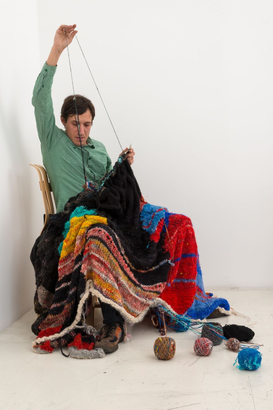 The show presents new works, many of which take the form of large-scale yarn compositions wall mounted on wooden stretchers. According to the gallery, the pieces stem from when Hansen took up knitting “to occupy his energetic mind while away from the studio.” He drew connections between the knitting process and kinetic art, and has since become so enamoured with it that he apparently “sometimes shears the sheep himself, before skirting, washing, dying, blending and spinning the wool.”