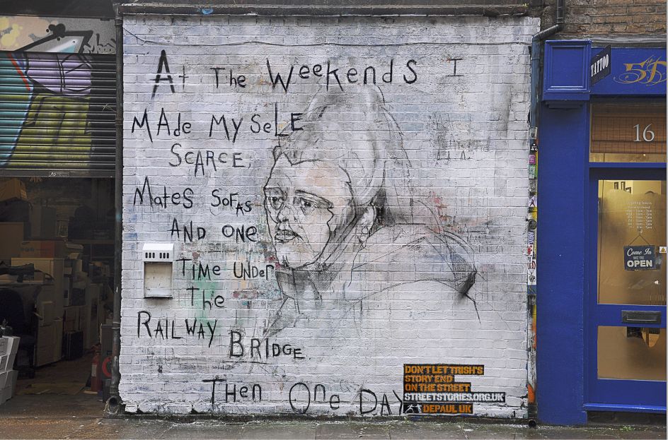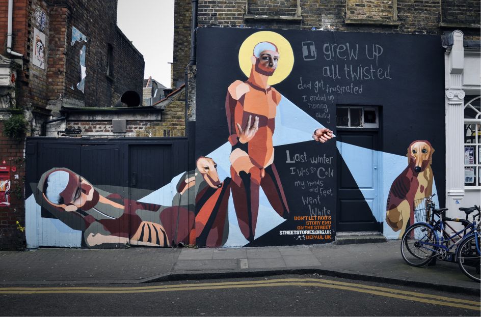 Each artwork appears as a mural situated in Dalston and Shoreditch in East London. Young homeless people were interviewed and their real life stories were used to inspire the artists. Each artwork gives an insight into the factors that led to a young homeless person’s current situation.