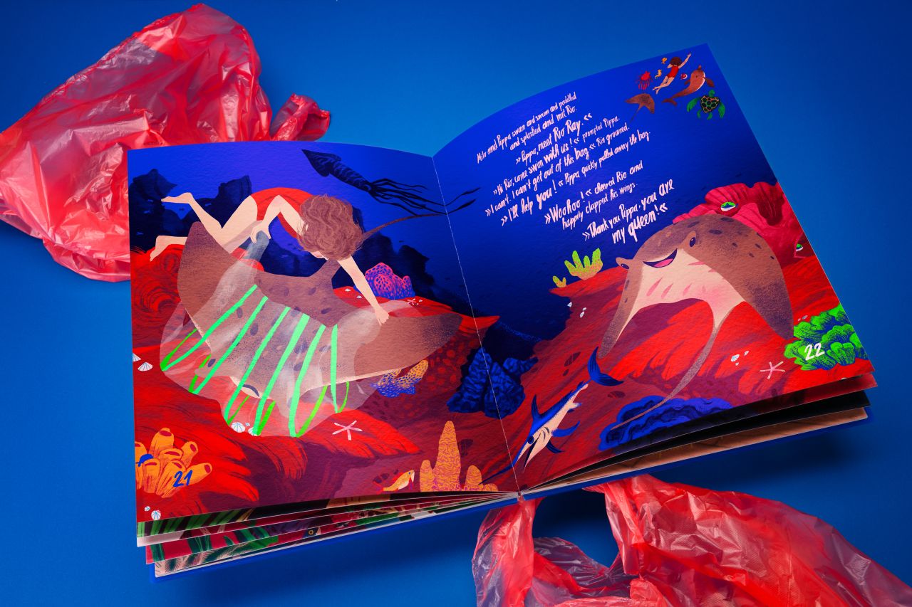 It tells the story of Pippa. Her biggest dream is to swim with every animal in the ocean, until one day, she finally gets to live her dream. But on her adventure through the deep blue sea, she realises that the animals can't swim: they are all trapped in plastic. But the brave heroine is able to help them, banning plastics from her home for good – and becomes the Queen of the Ocean.