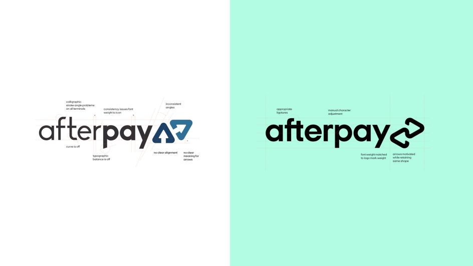 The agency retained the former branding's two arrows that were used in the logo, reimagining them as a "linked, continuous form that evokes balance and interconnectedness. This new logo looks to represent "how the relationships between Afterpay, their partner merchants and customers are continually strengthened each time they interact with one another," says YummyColours.