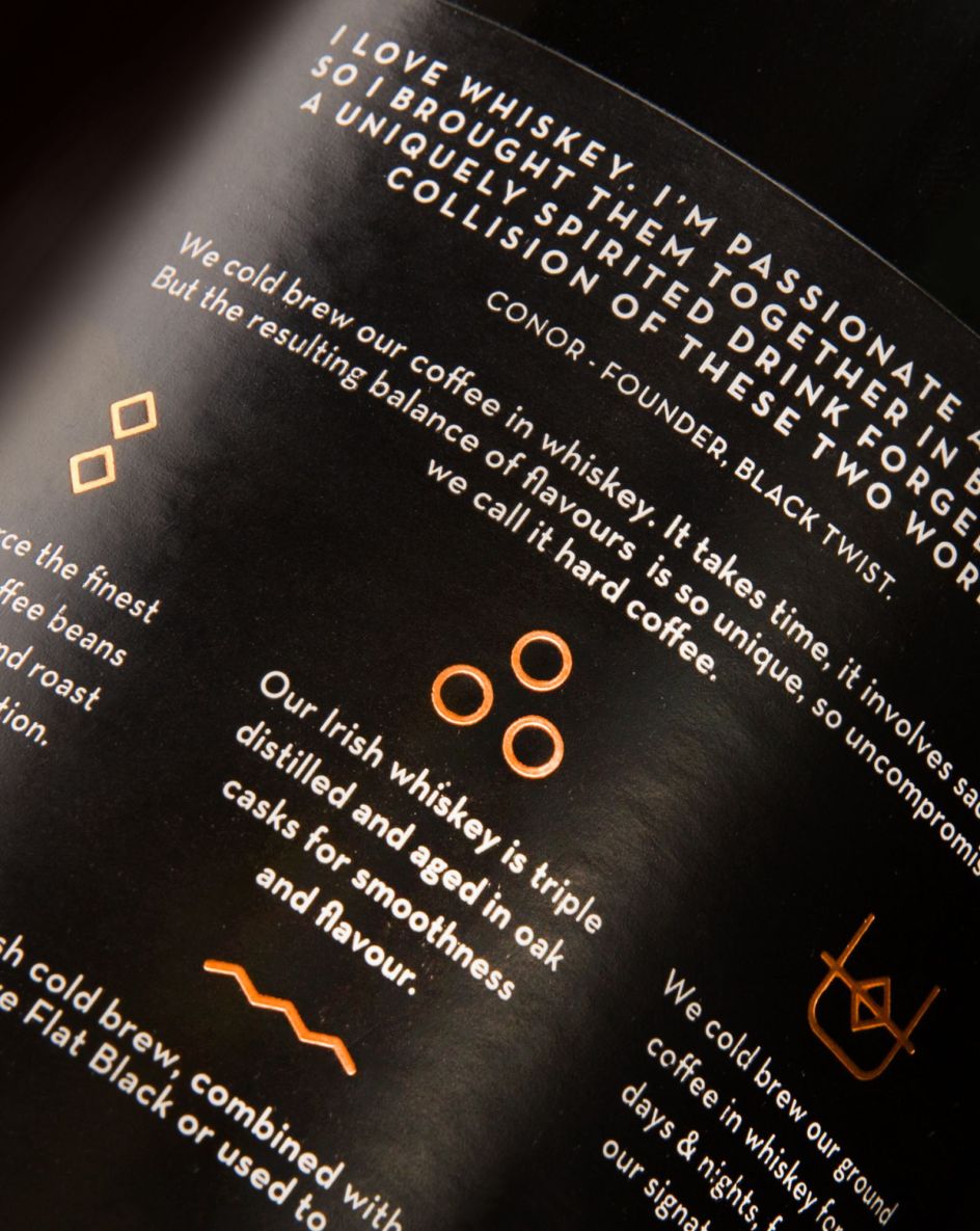 The team then created a distinctive white logo against a striking black and copper design with a slick, subtle 'twist' pattern. The 'crafted' texture in the cardboard-effect label evokes artisanal cues, and clear pack messages and icons capture the Irish provenance and tell the tale of the two key ingredients, echoed in the punchy brand story. The distinctive bottle shape with its hard lines and broad shoulders completes the look.
