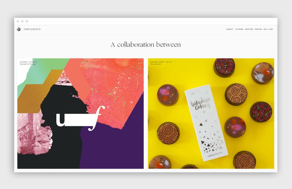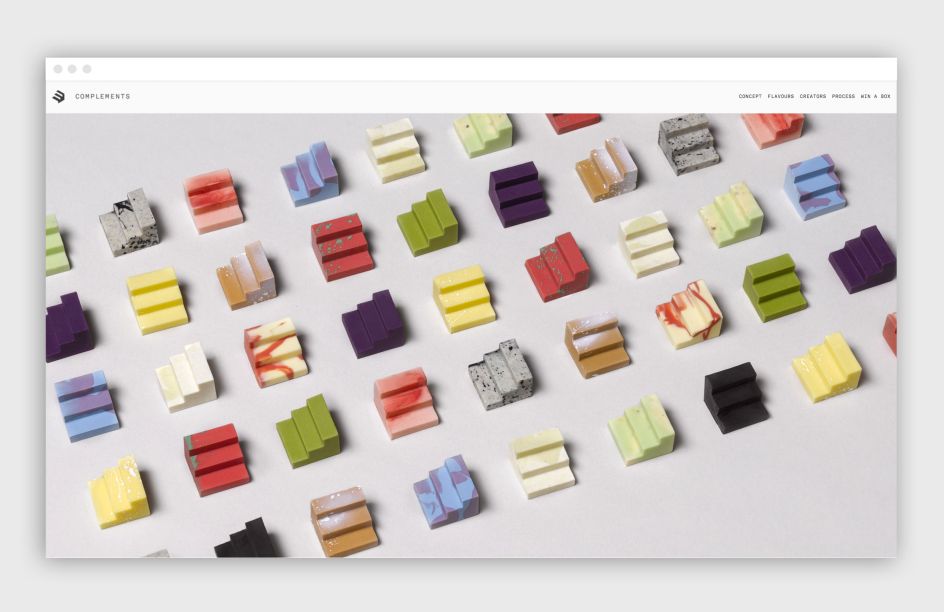 Although Complements was created for Universal Favourite's clients, they wanted to share the love, so created a website to tell the story of the chocolates, giving people the chance to invent their own flavour and win a box of their own, with a pairing of mango and black sesame winning top prize, a combination that makes us drool.