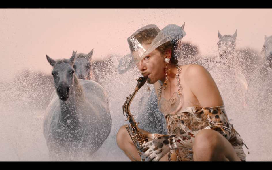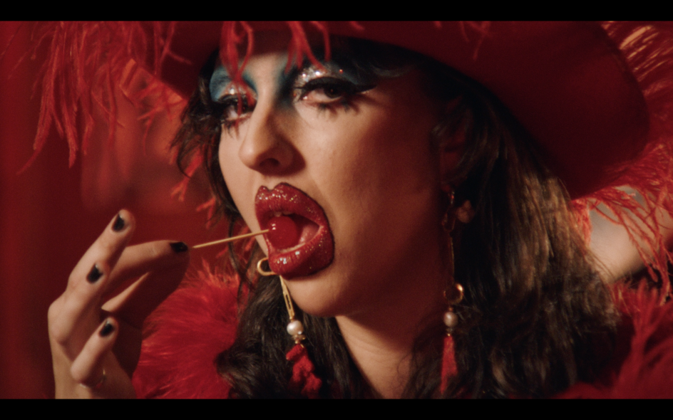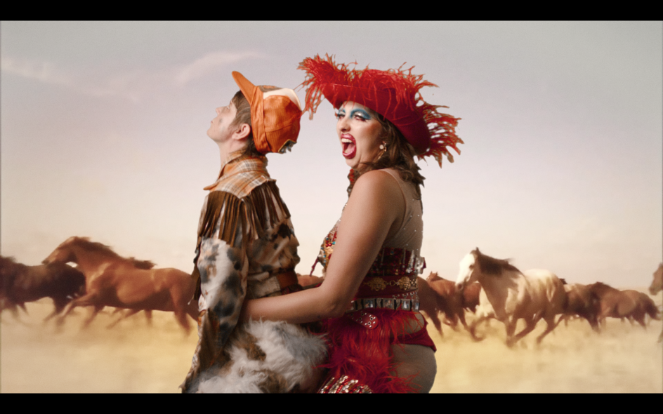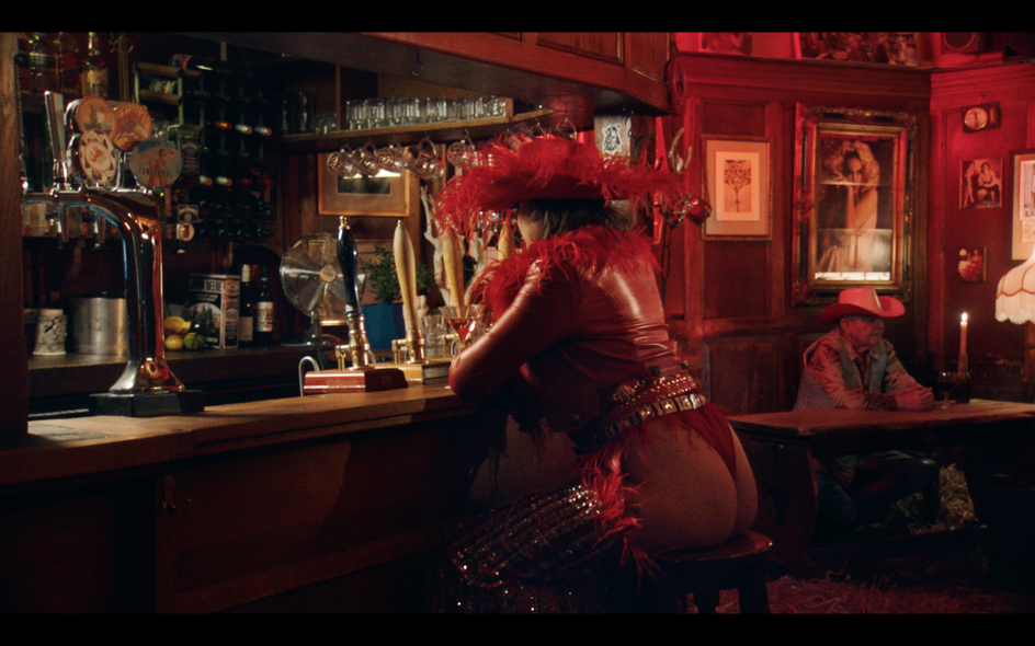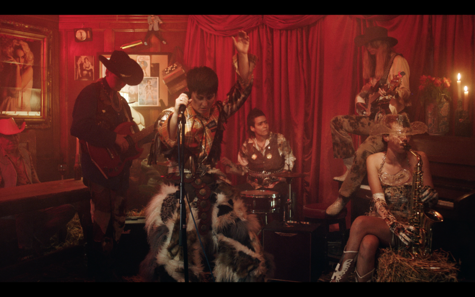 Aside from some wild green screen trips, the story is driven more by lustful looks and exaggerated gestures than conventional action. The Lonely Cowgirl is played superbly by performer Lilisque, who acts alongside the band themselves. The creative team working on lighting, art direction and styling all hail from London's queer scene; and their main goal was to "make the four walls of this surreal and otherworldly saloon feel like it could be 1970 or 2030," says Garnett, who also works for production company Somesuch.