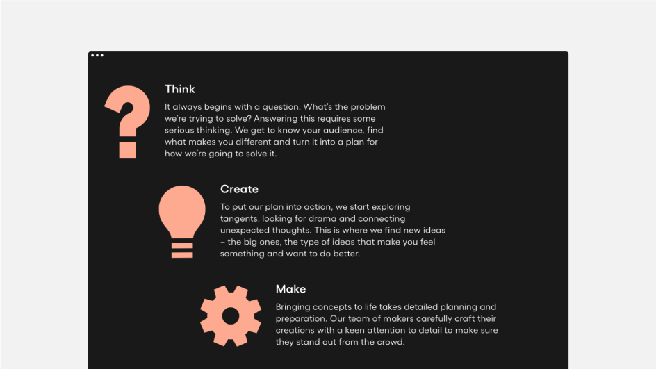 It means that it takes stock of each client or piece of work in terms of the studio's own value system. "The world doesn't need more of the same," says the studio. "We create brands, campaigns and award-winning content, so the world can get what it really needs."