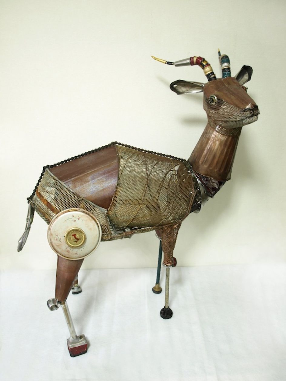 The Small Forest is a new exhibition featuring a series of wild animal sculptures by Japanese artist Natsumi Tomita, created with found objects and salvaged scraps.