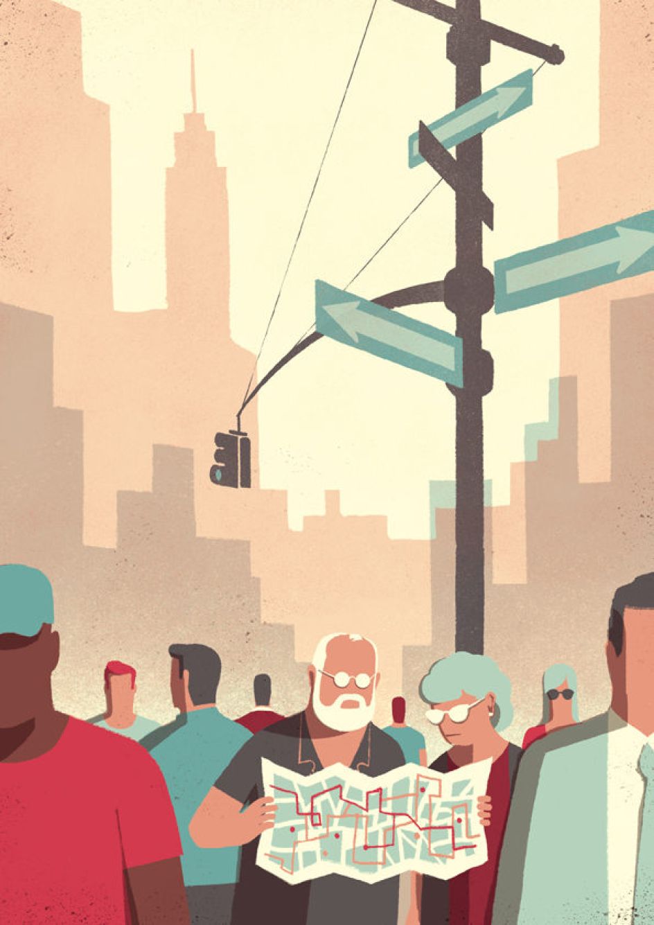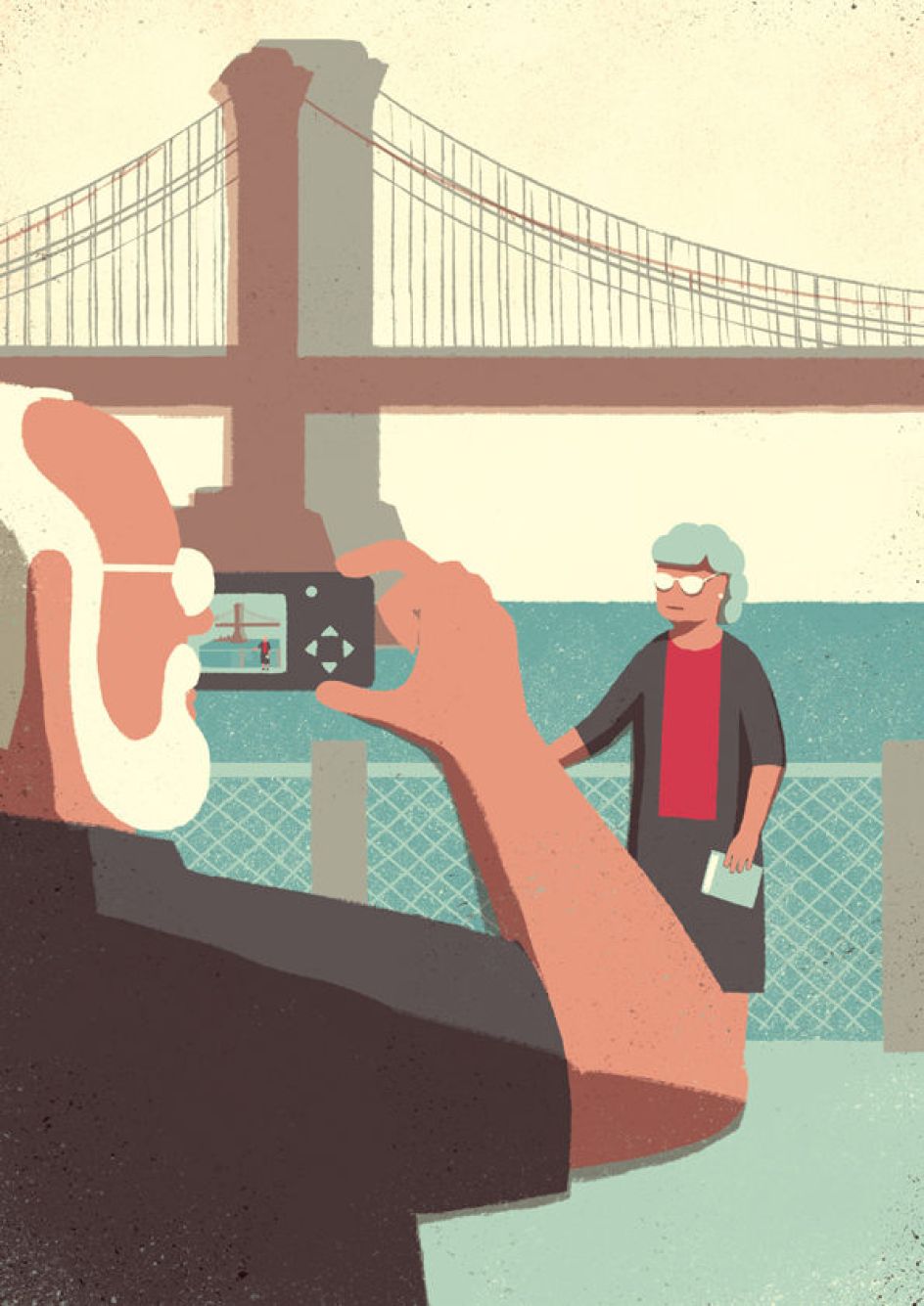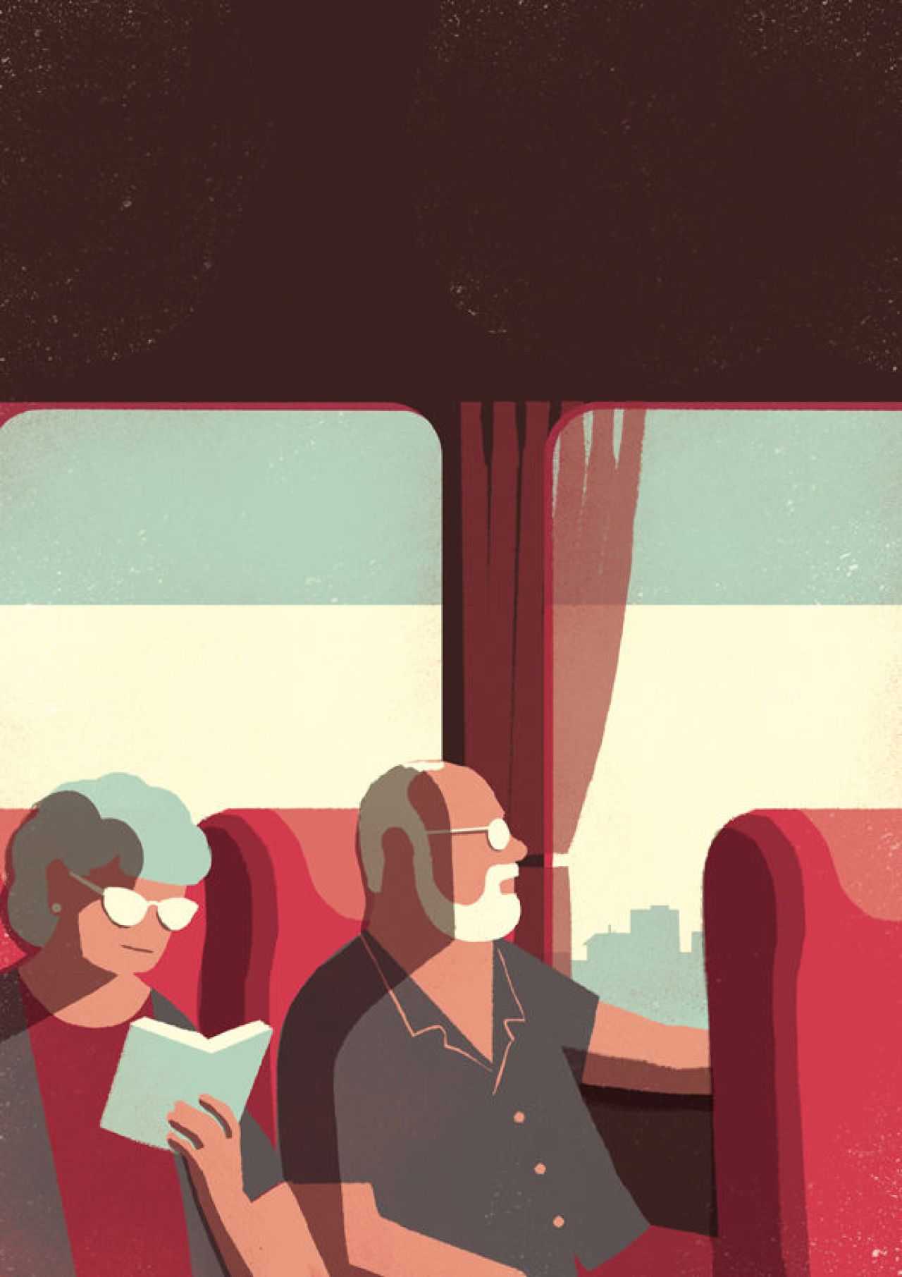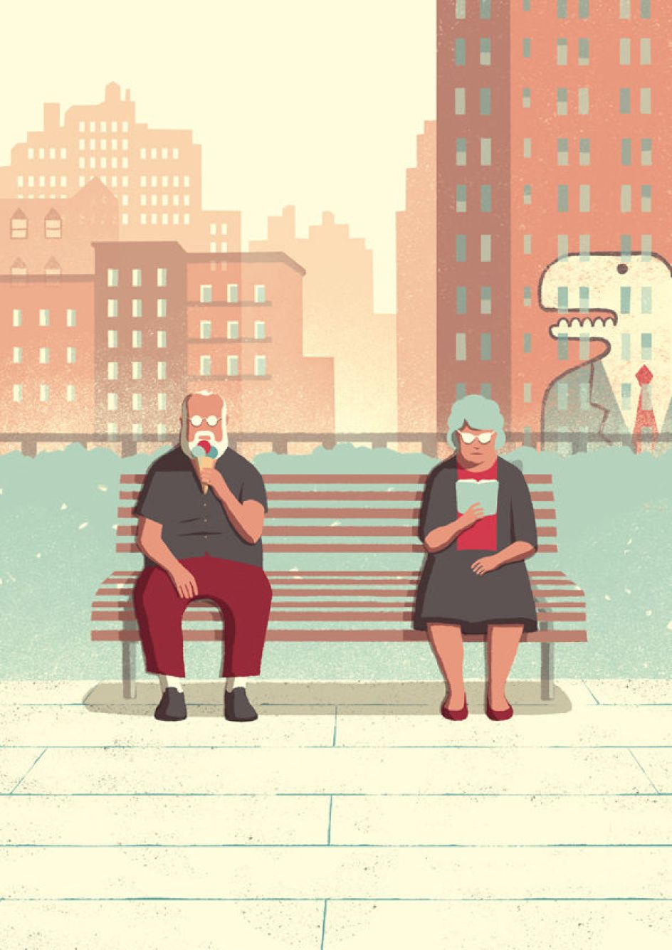 This series is by Italian illustrator Davide Bonazzi. The images follow an elderly couple on their holiday in the big city. After arriving on a coach, they take a look at the sights, ride on the underground and enjoy an ice-cream.