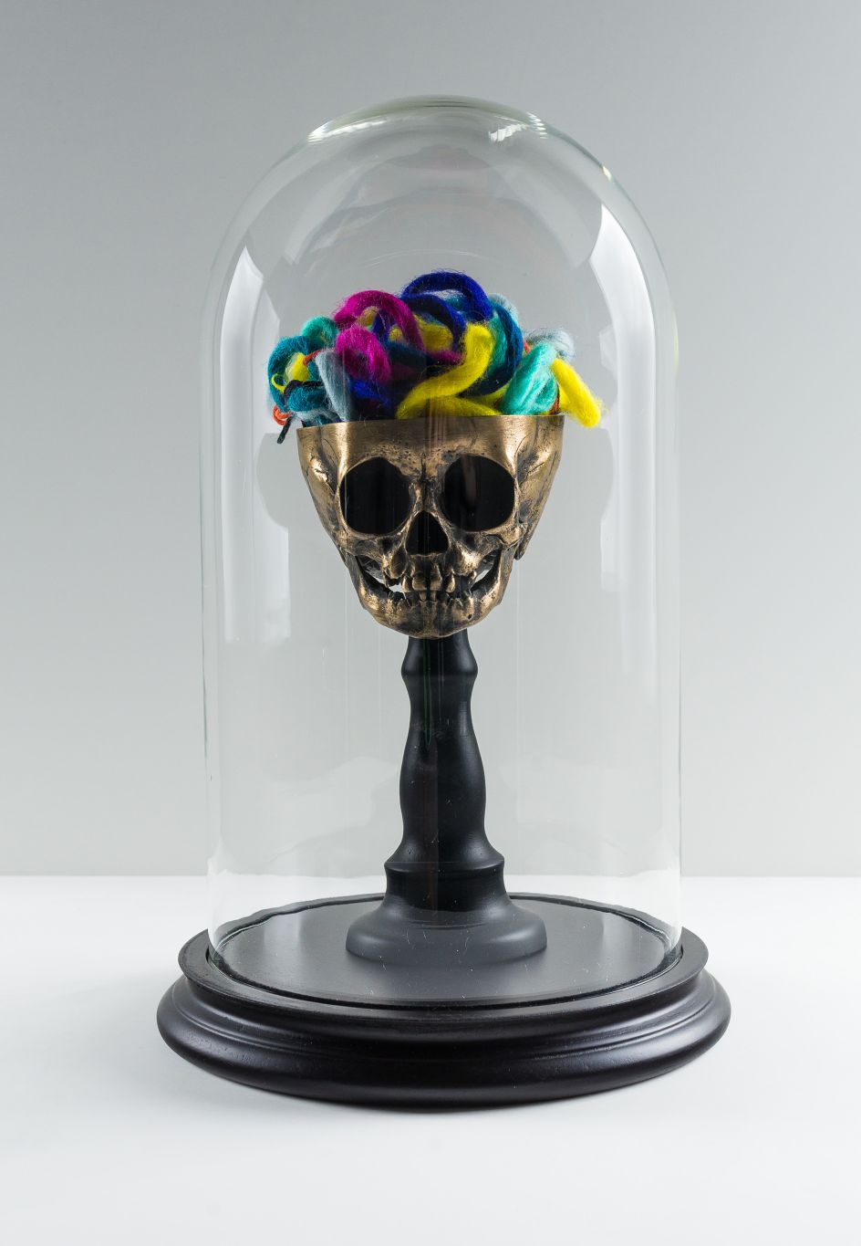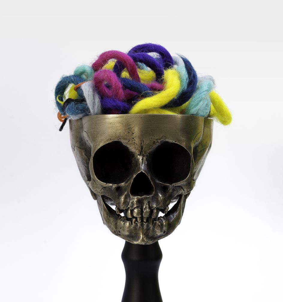 Dance Boldly Through the Storm will feature a set of bonded bronze skulls that have been cast from a mould made from a real 12-month-old human skull. The craniums are filled with tangled balls of beautifully dyed Peruvian wool, each strand dipped in clear resin before being shaped and sculpted and knotted into a complex scrambled mess of colour.