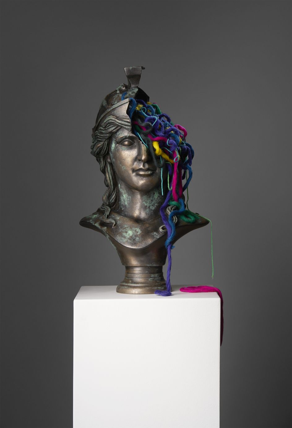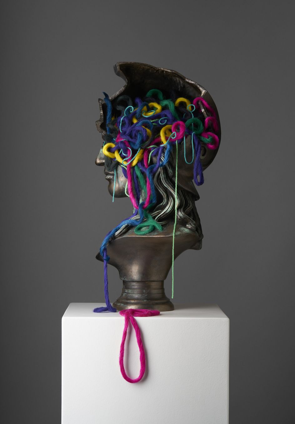 Eelus comments on the process and the meaning behind these pieces: "I have about 30 minutes to tease and shape the mess before the wool starts to set solid. Like with all my work I’m really drawn to the contrasting elements at work. The cold, dull, heavy solidity of the bonded bronze against the light, soft, brightly coloured wool.