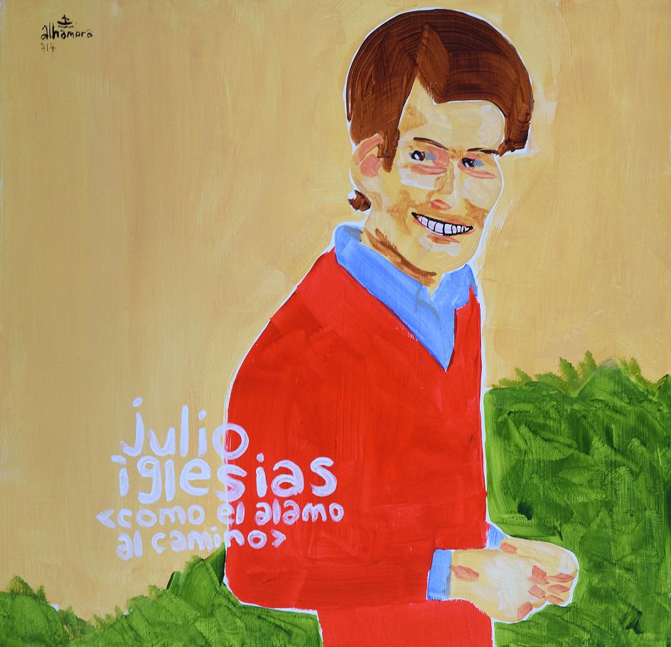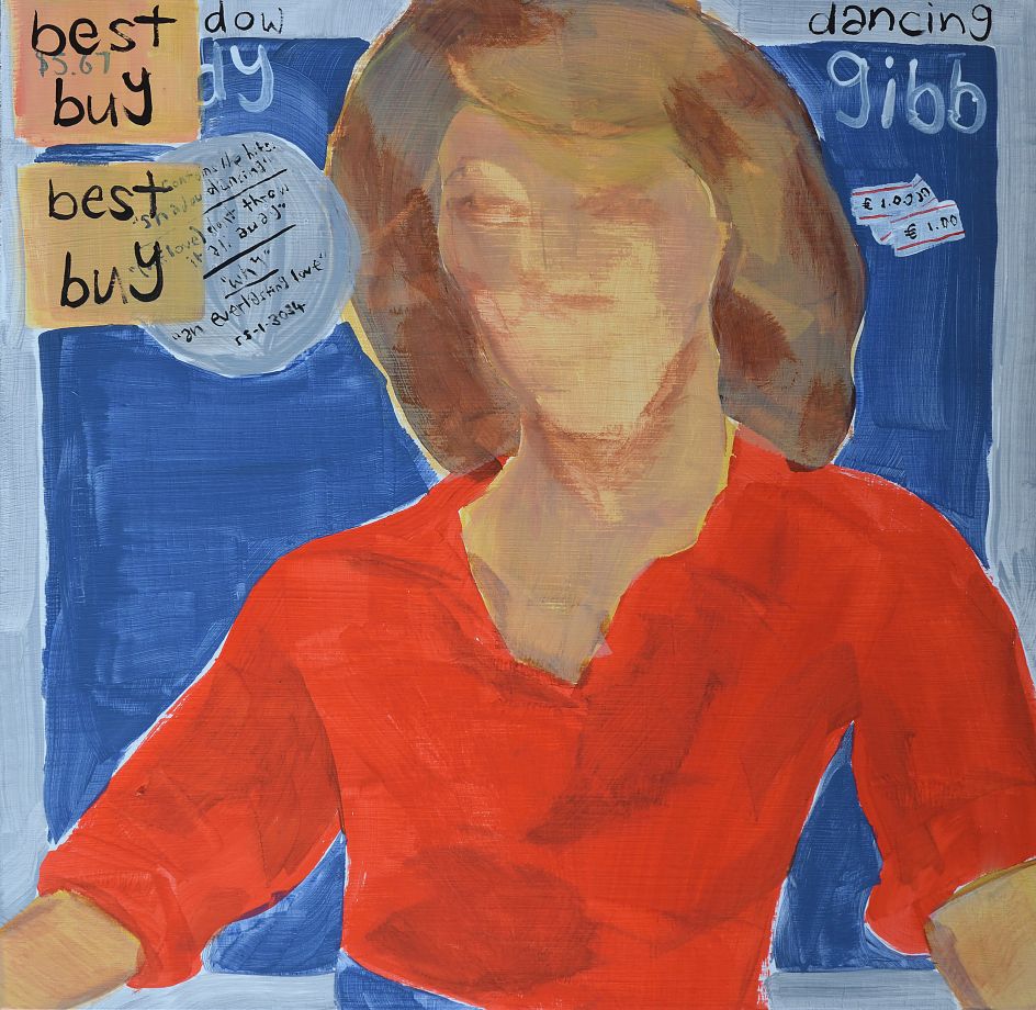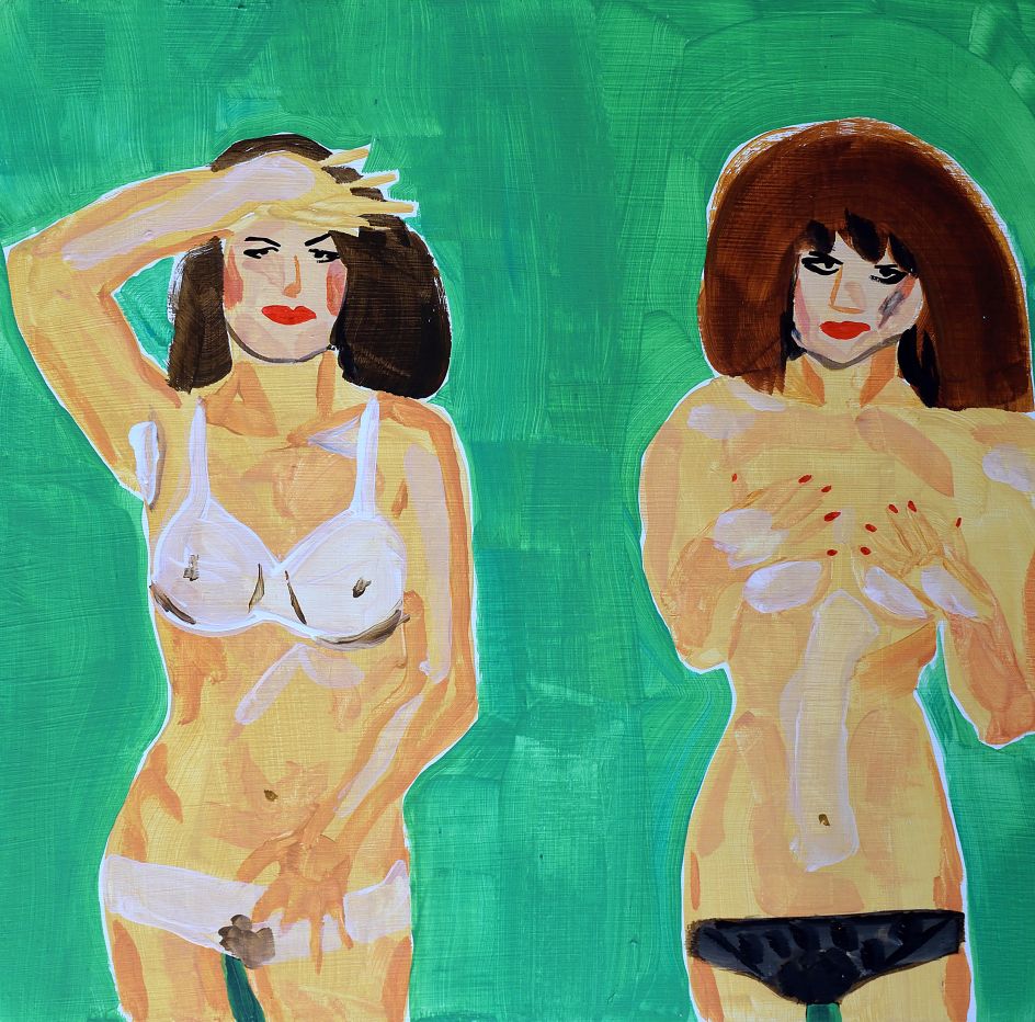 Painted with acrylic on primed 30x30cm squares of wood – usually sourced from B&Q if the staff on the cutting counter feel like sawing sheets down to the appropriate size – the images usually start with the flesh tones that are generously laid down with a big brush. One brush movement sorts the head, then the hands and hair, preferably done in one big sweep.