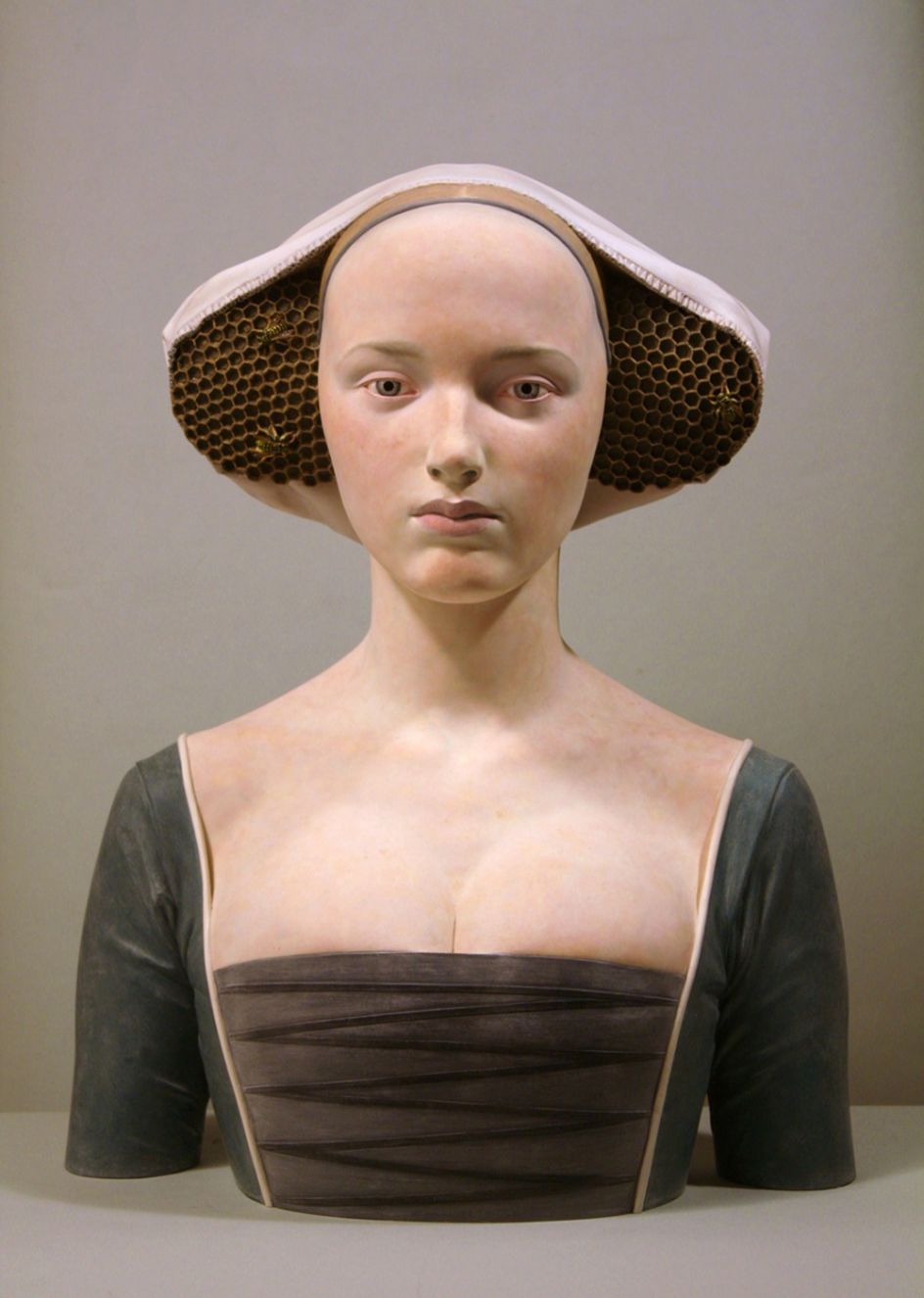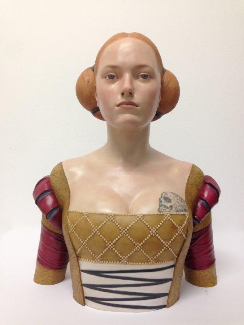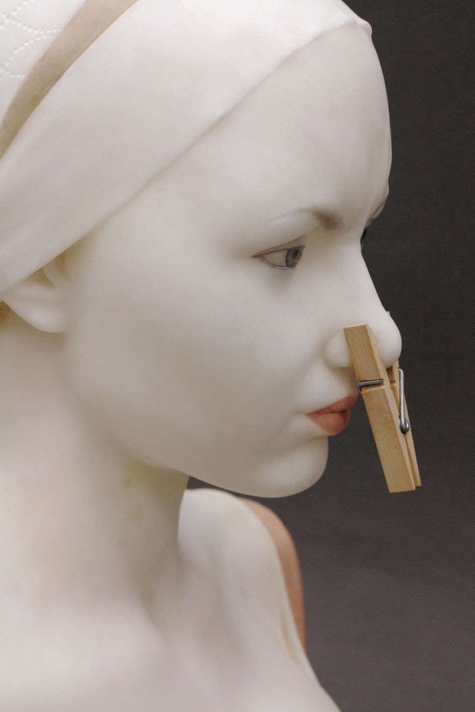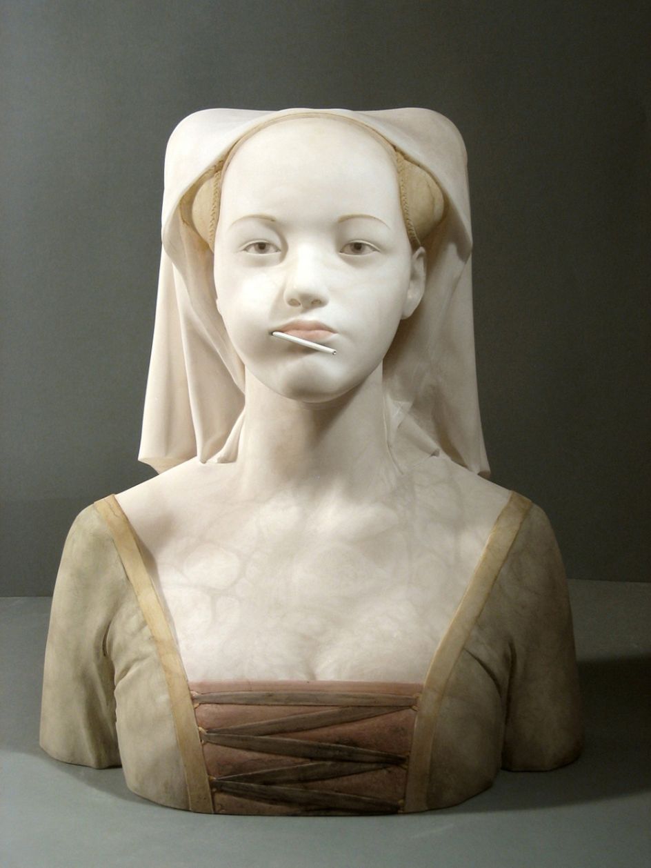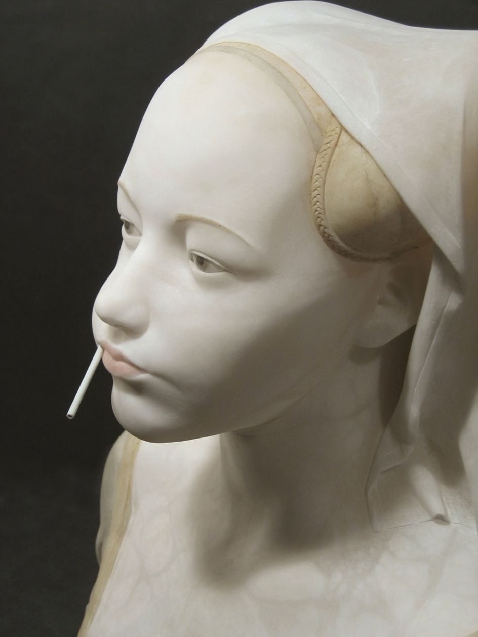 Evoking Florentine portraits with a contemporary twist, he uses marble, alabaster, wood and resin to craft his extraordinary busts. Seemingly plucked from the Renaissance period, it comes as a surprise to see his imagined characters picking their noses, blowing bubblegum, sucking lollipops or donning a skull inspired tattoo. An extraordinary theme to all of his works is that the skin takes on a very realistic form, making the female busts appear almost too real.