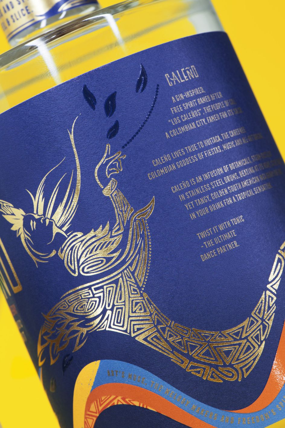 "She’s a joyful expression of Caleño’s belief that you don’t need to drink alcohol to have a fun-filled night out and embodies the brand’s message of “Carpe diem, carpe nocturne” - seize the day, seize the night. She dances energetically on the label in a billowing dress of bright, colourful Incan patterns inspired by traditional methods of printing textiles using Olmec roller stamps. Gold foiling and embossing add a premium touch."