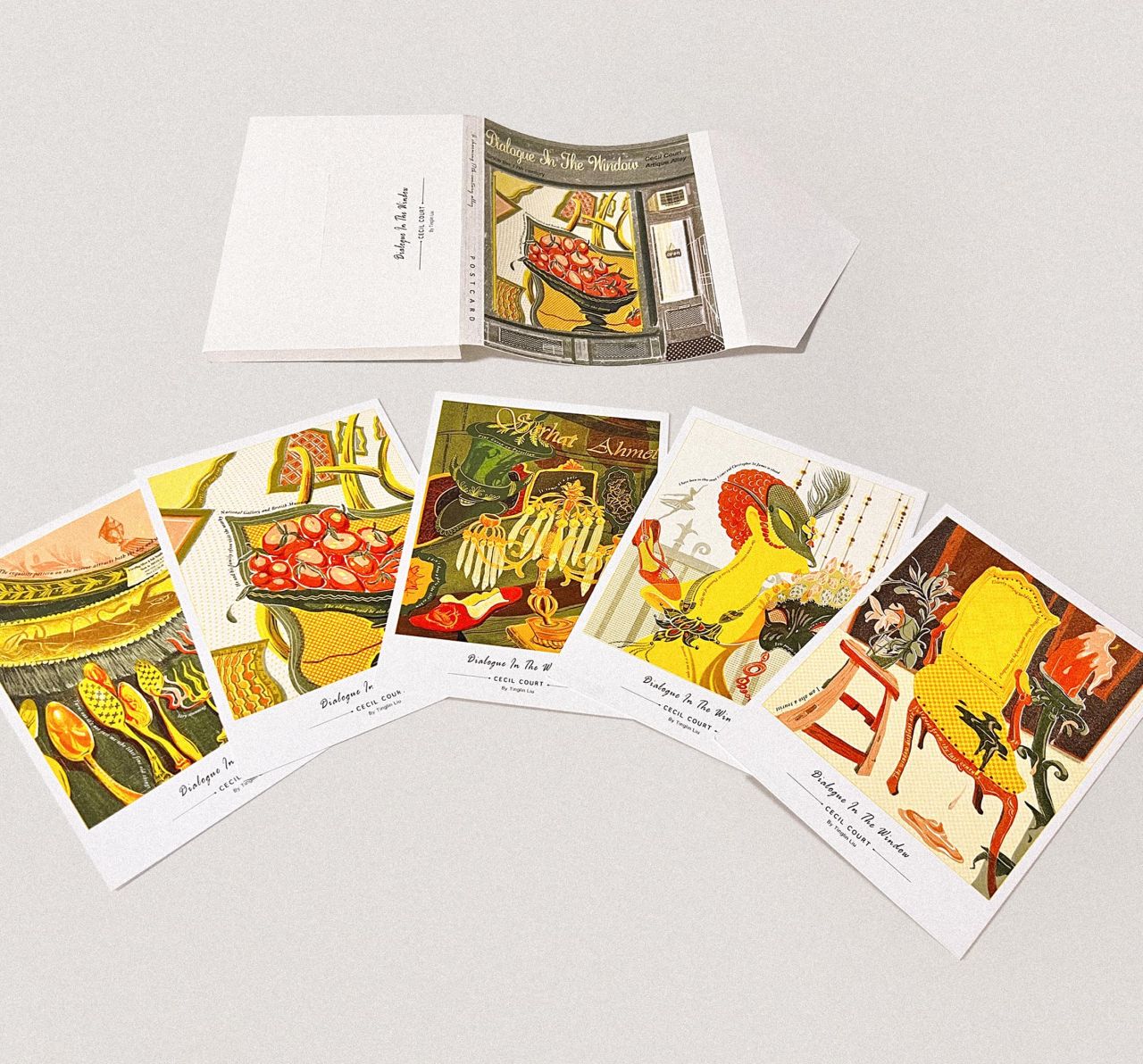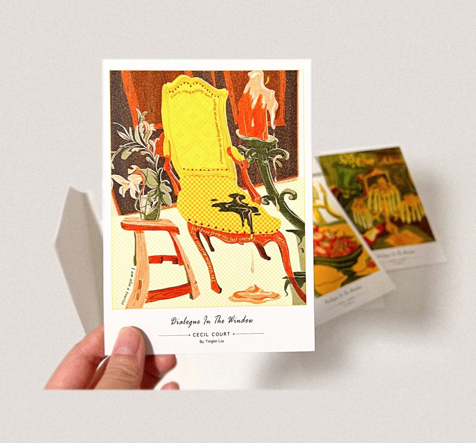 "This piece draws inspiration from the Poetry Comics, inspired by my observations of Cecil Court," she explains. "Through poetic illustrations, I've captured the interactions between people and still lifes on this street, ultimately crafting them into a set of postcards and postcard box, each intended to land in the hands of visitors."