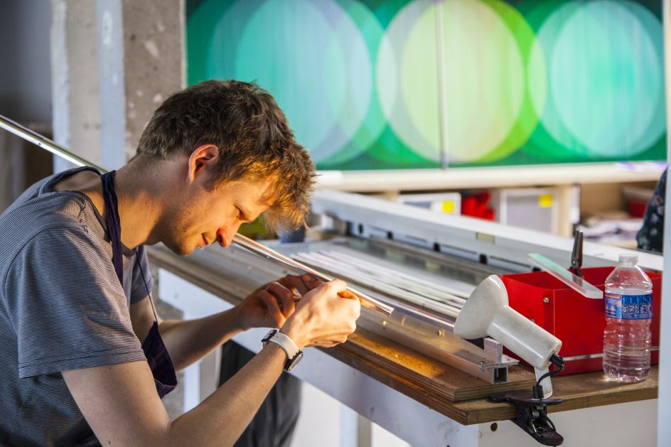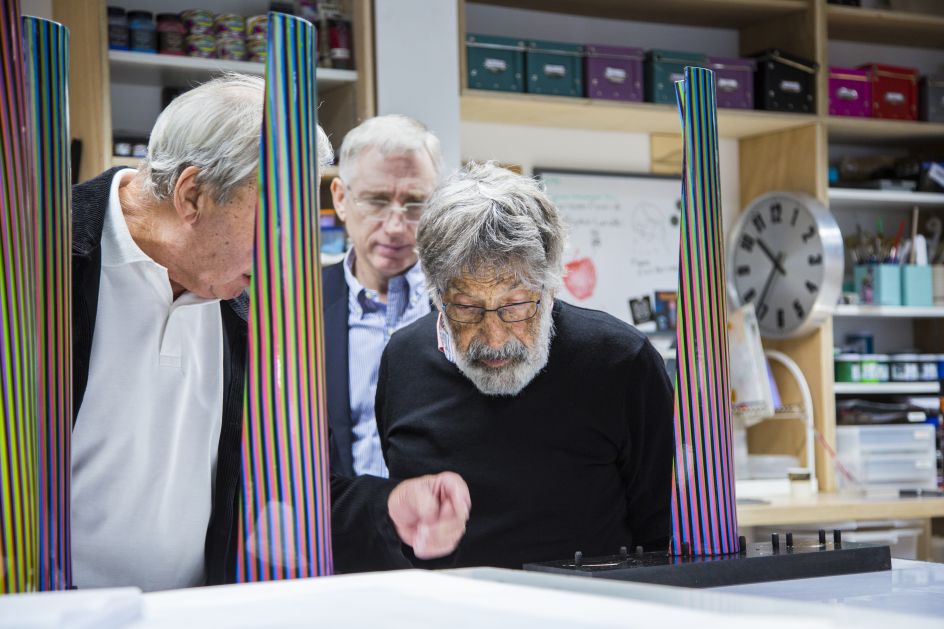 Carlos Cruz-Diez is a world-renowned artist and one of the greatest living figures in kinetic and op art. He creates interactive, immersive works that invite viewers to reconsider how they perceive the world – and at 94 years old, he continues to evolve as an artist, employing the newest digital technology in his Paris atelier, where he works with his children, his grandchildren, and a team of craftspeople who help bring his ideas to life.