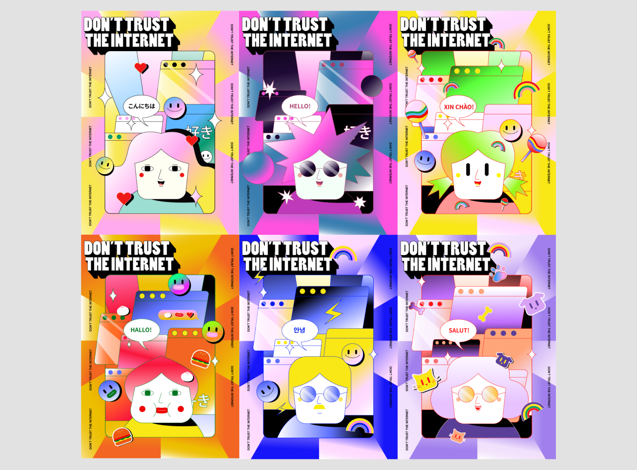 Titled Don't Trust The Internet, the bold and vibrant posters offer a chance for Nguyen to experiment and play with different shapes and colours while exploring the "extraordinary diversity of people online", as he puts it. They also act as a non-official public service announcement, urging others to be careful when they're logged on. "The internet makes it possible for us to connect with anyone anywhere. Despite its numerous benefits, it can also be a very dangerous place. The fact that we can pose as anyone means we face many risks, and one of them is cyber fraud."