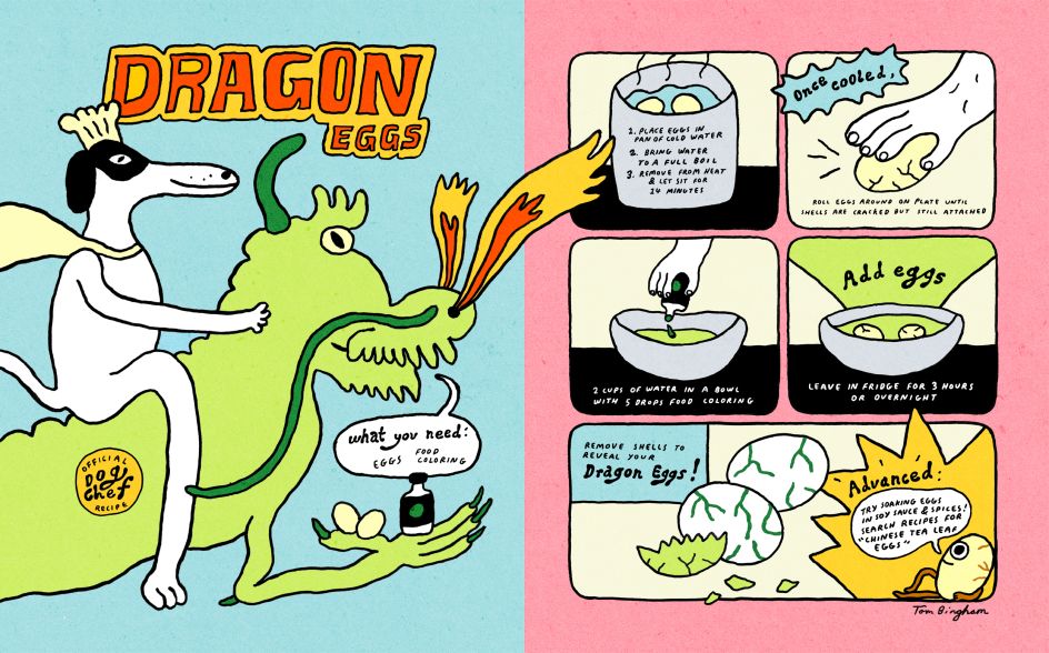 This sense of fun and connection was a perfect fit for Illustoria, the magazine for kids and their creative grown-ups, who called out for illustration pitches back in 2019. Tom leapt at the chance by creating a culinary canine character called Dog Chef. "The magazine is aimed at kids, so I thought it would be fun to do a recipe that they could follow along and make at home," Tom explains. "I sent over a scribble of this recipe to make pancakes for your dog. I needed a character to illustrate the steps, so I drew a dog in a chef's hat and thus Dog Chef was born."