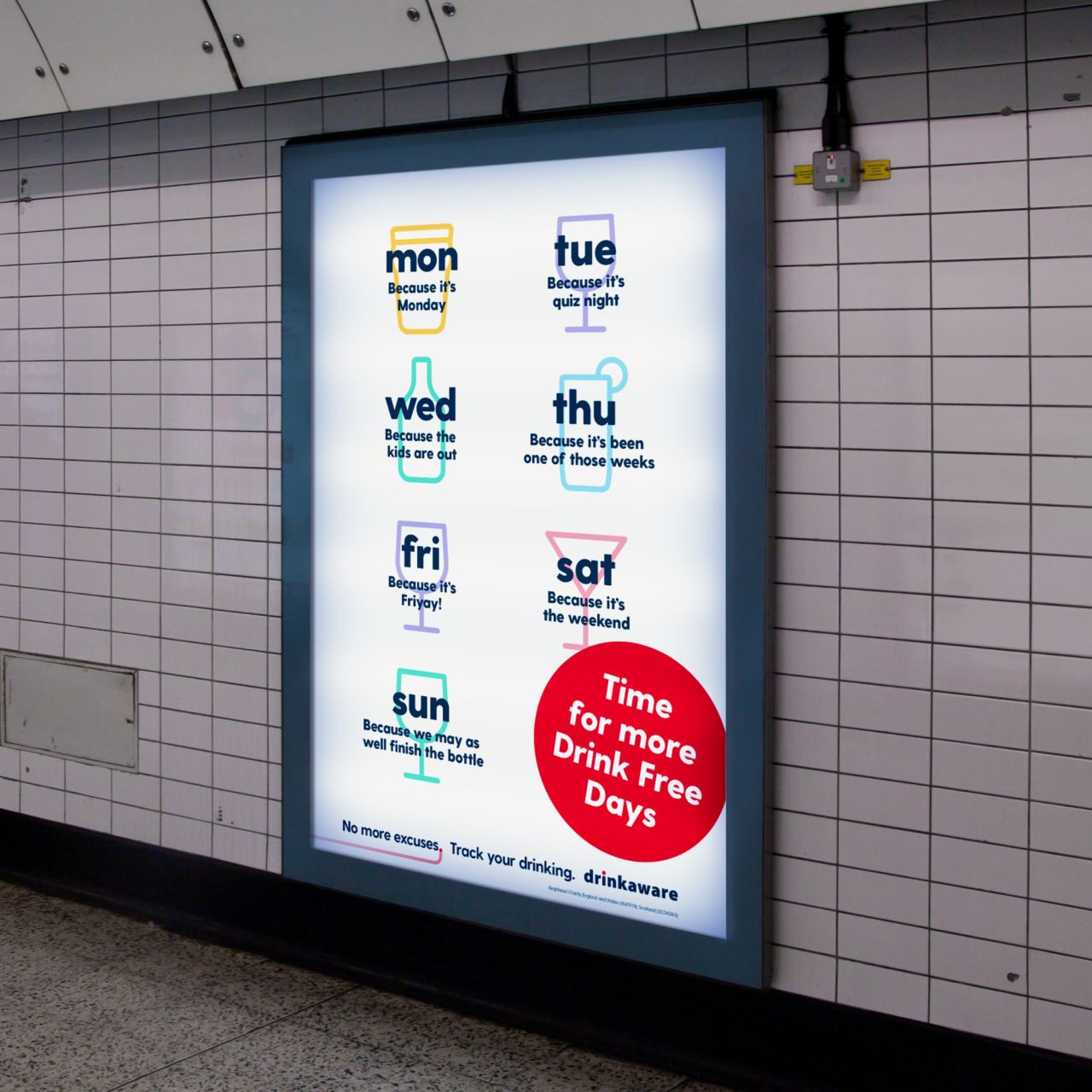 The campaign was designed in-house by The Corner Design and is the "inaugural showcase" of the new Drinkaware brand look and feel. It's delivered via national OOH, targeted social media videos and digital display.