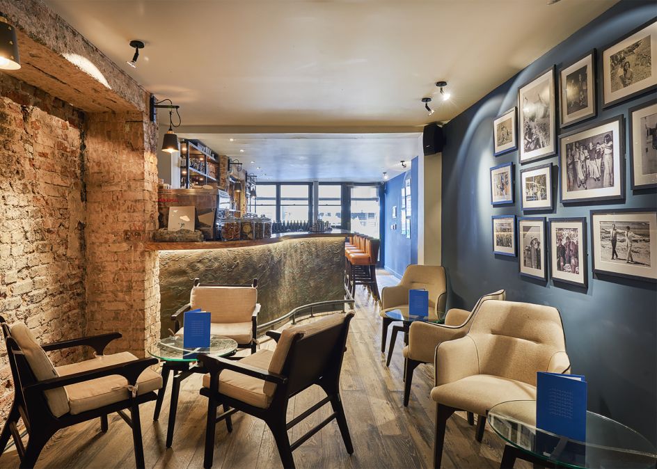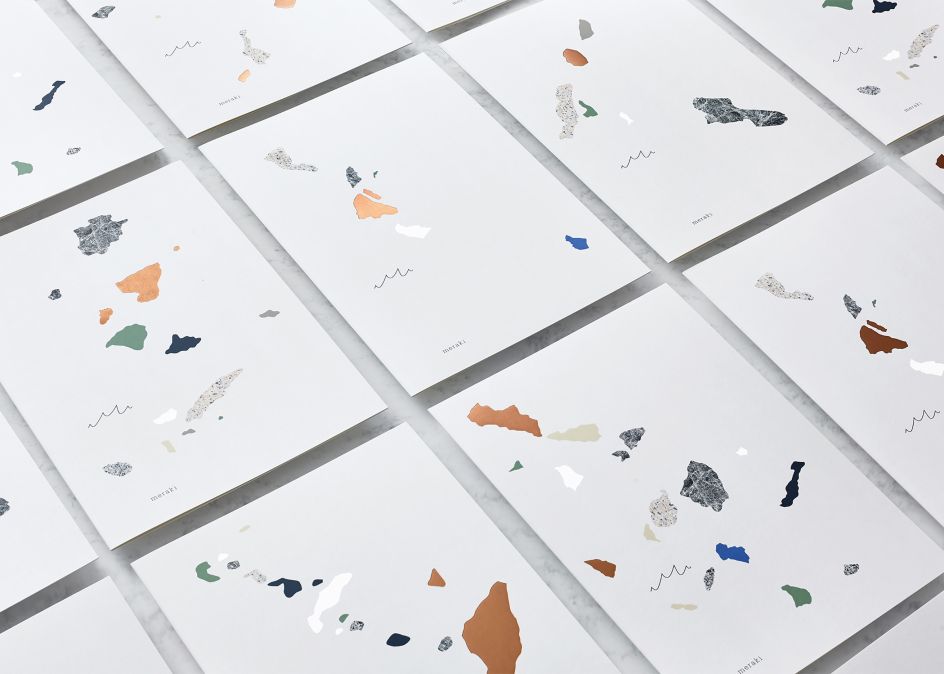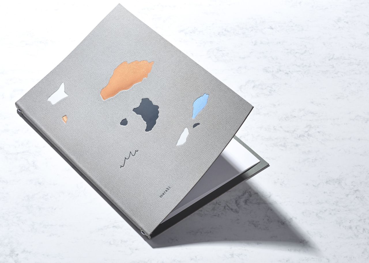 "There are six key island formations in Greece and this became the inspiration for the menu designs, created using a medley of finishes and textures, to subtly reflect terrazzo," explains Ross Goulden from Dutchscot. "Five of the formations are used on the food menus with the sixth being used on the wine menu. The M of Meraki lent itself to representing the sea and therefore works in both the context of the islands but also as a pattern in its own right.