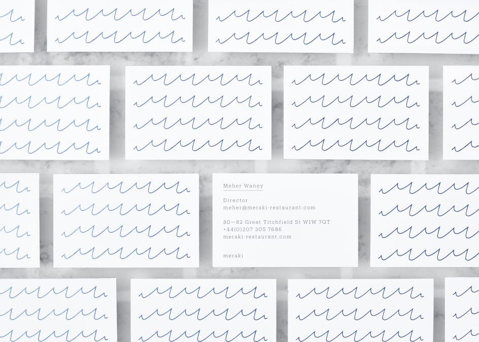 Materials also played an important role in the new identity, From the bright white textured menu paper (Zen from G.F Smith) which emulated Greek architecture to the vibrant blue paper used on the bar menus, evocative of Greek church roofs and the mediterranean sea. A pale grey leather was used for the wine menus to reflect the interiors. Ross adds: "The 'M' is coupled with Meraki typeset in Produkt by Commercial Type, we liked its attractive but functional quality."