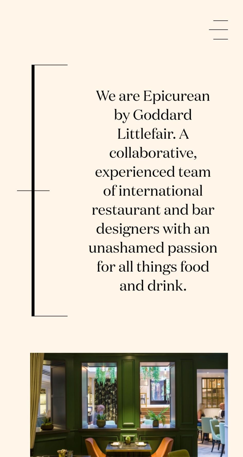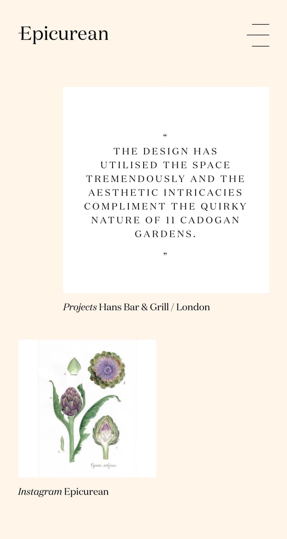 'Not just another portfolio site' was the brief for the website. The homepage is designed to be deliberately explorative with a visual collection of all things Epicurean, from sketches through to finished pieces. Content is also automatically pulled in from their Instagram feed to keep the website continually evolving. Epicurean's case studies are also structured according to the 'people, places and food' philosophy with each one loosely divided into three sections; as are the team member bios, with each person naming their favourite chef, restaurant and meal.