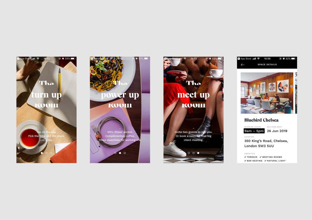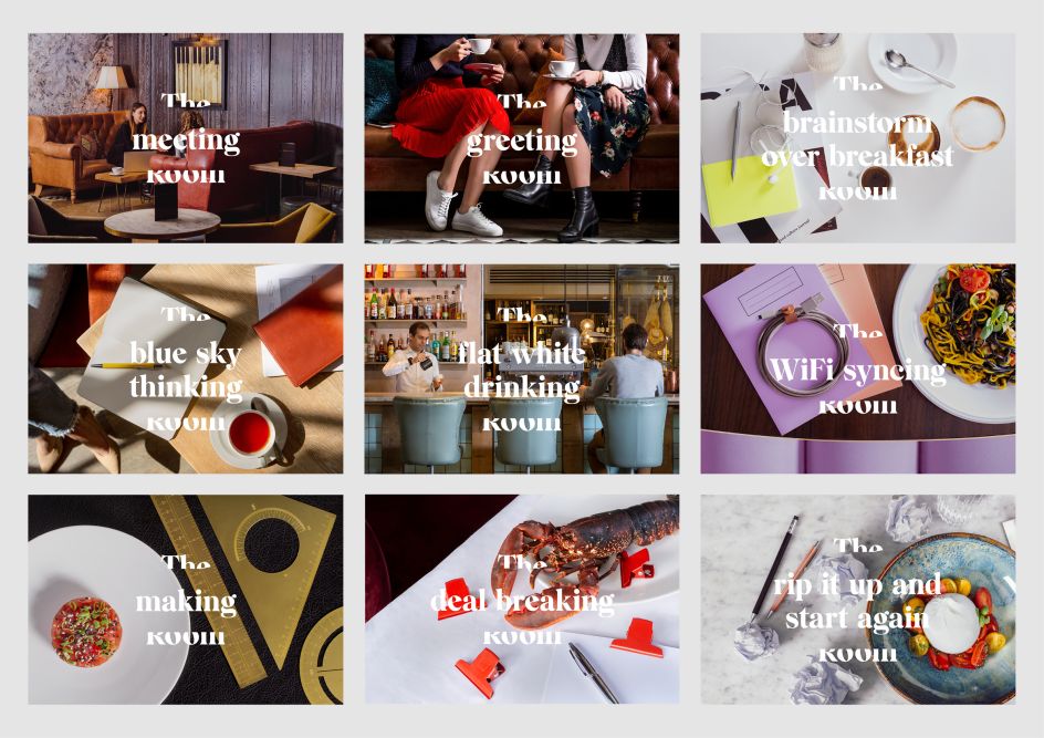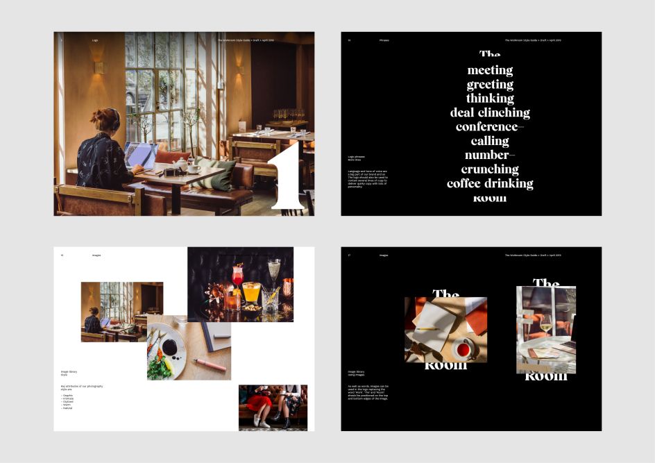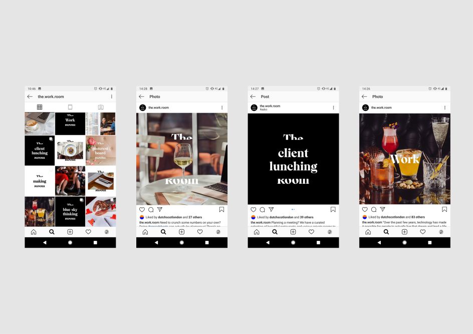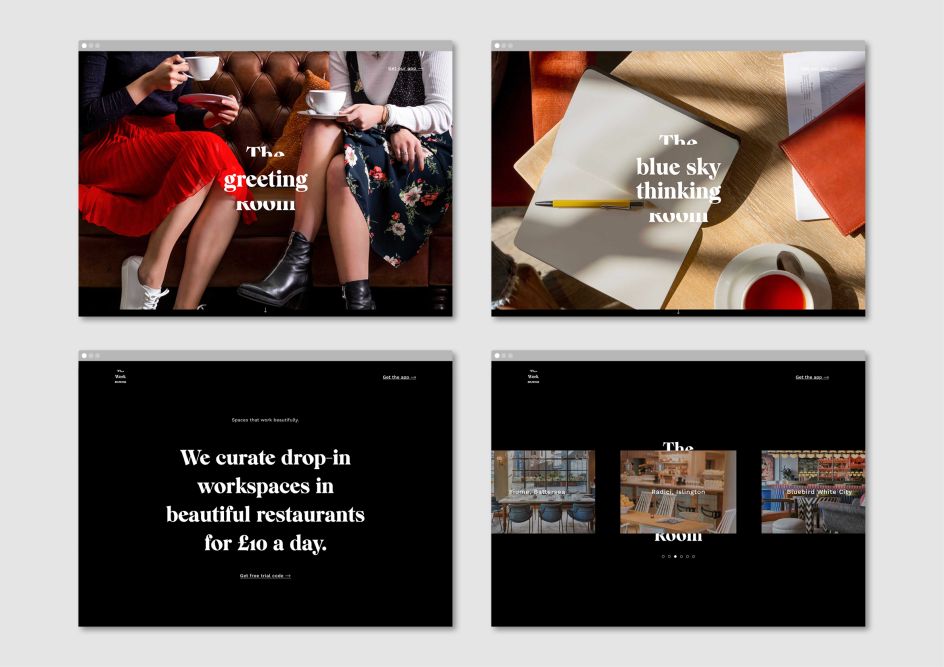 "With ‘The Workroom’ being quite a utilitarian name, we created a logo where the word ‘work’ can be replaced with a series of messages and imagery," says Jacob Vanderkar, one of the founders of the London studio. "This ’space’ in the logo is used to showcase the variety of beautiful restaurant interiors, the metaphorical space they provide people to think and work, whilst also showcasing the diverse range of activities that people can use them for."