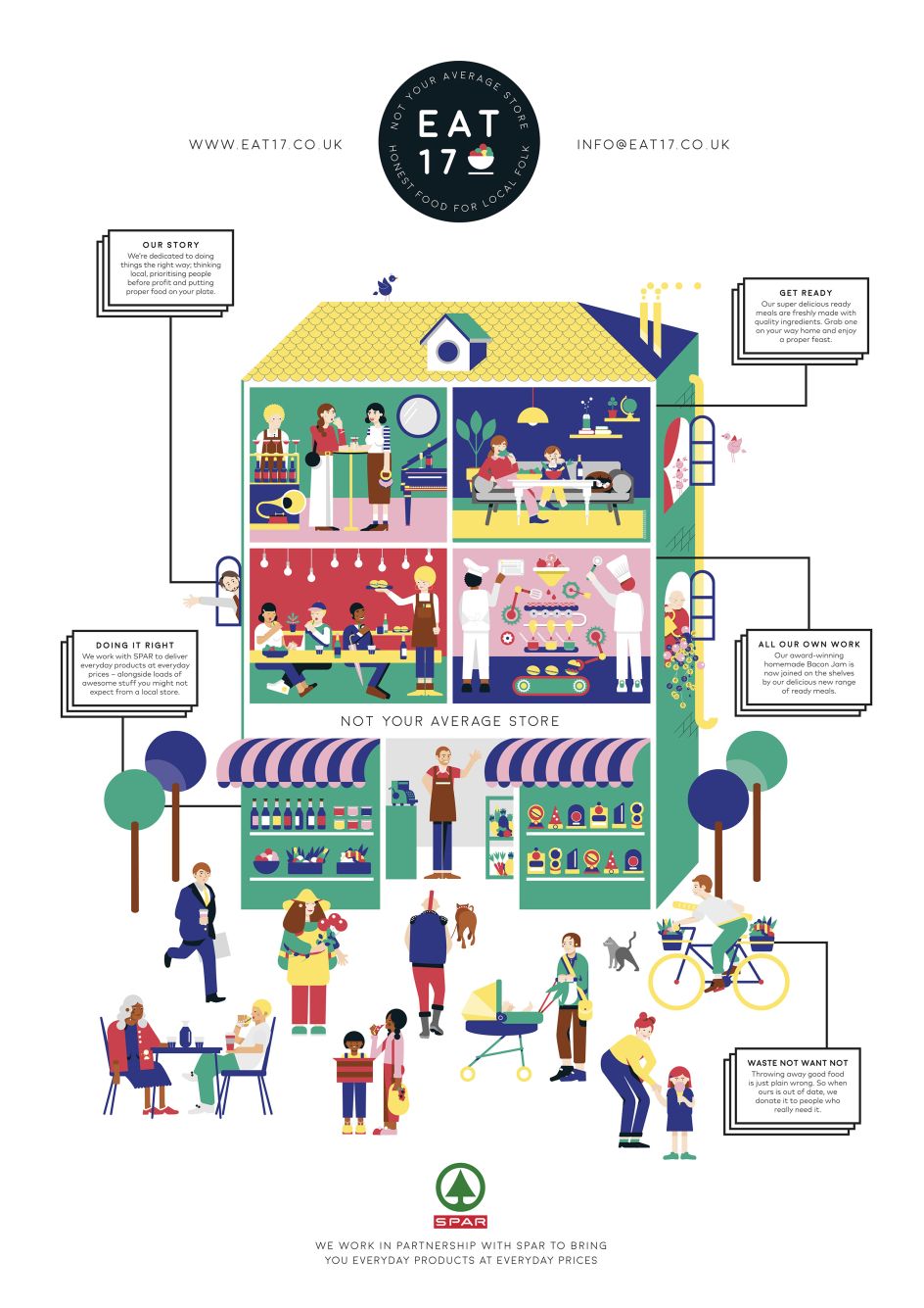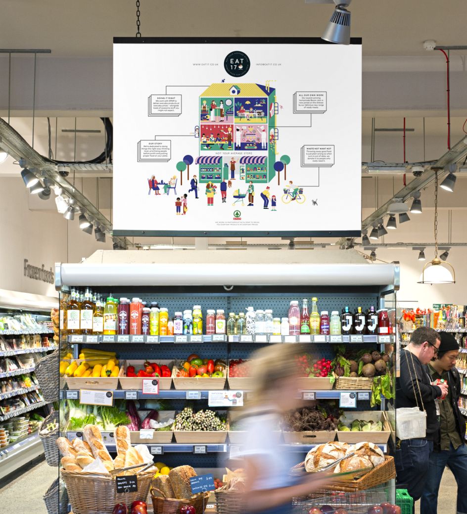 Creative director Katja Thielen gives some background. “When we started working with Eat 17, we created a dynamic illustration called 'The House of Eat 17’, where each room depicts a different part of their many food offers: shelves filled with juicy fruit and veg, busy chefs making mouth-watering burgers, a cosy lounge area and restaurant where people can chat and catch-up. Meanwhile, the bustling activity outside shows Eat 17 at the heart of a thriving local community."