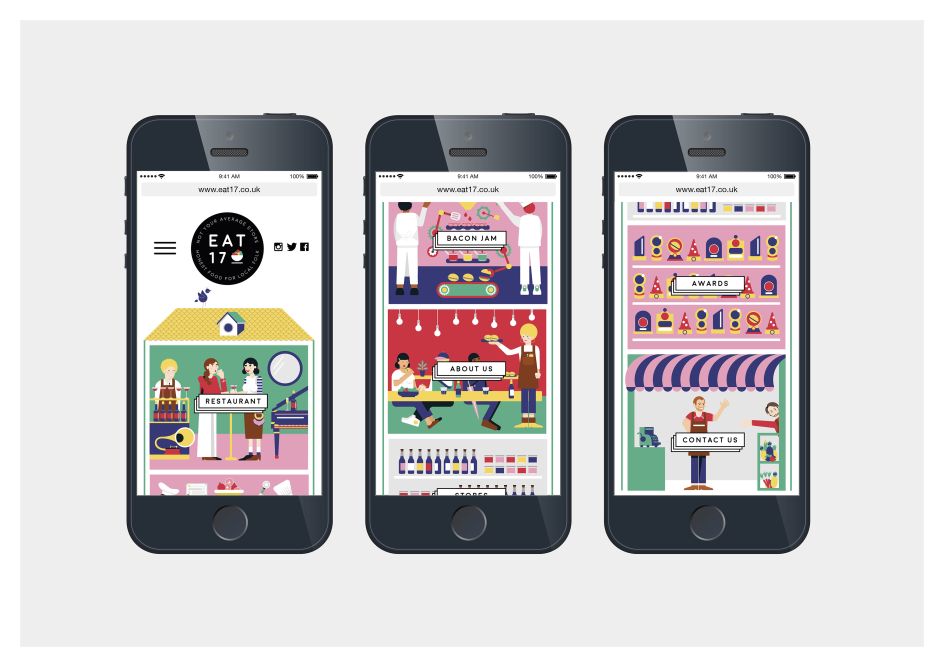 A bold, graphic colour palette helps the packaging stand out on the shelf, and the illustration style has a strong, independent feel. Adapting and developing ideas from the original ‘House of Eat 17’ illustration provides consistent identity through both the digital and physical brand experience.