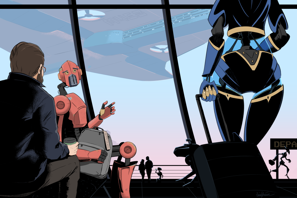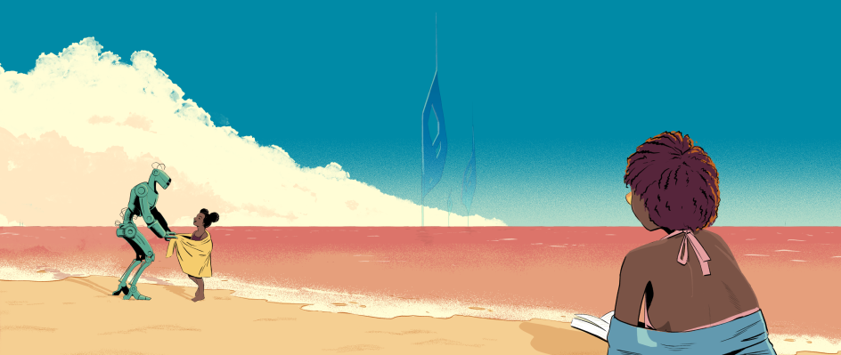That's Emil Paun's approach in his illustration series Techno Optimism. Inspired by the vast collection of sci-fi books he grew up with in his parent's house, these images picture a world where people and robots live together in harmony in a future where everything has, miraculously, turned out fine.