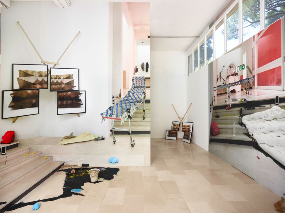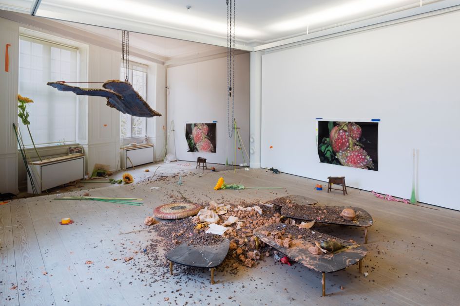 The first UK solo exhibition of French artist Emmanuelle Lainé visually transforms the gallery space into an immersive environment, bringing together familiar objects, organic materials and life-sized, floor-to-ceiling imagery to create a disorienting scene.