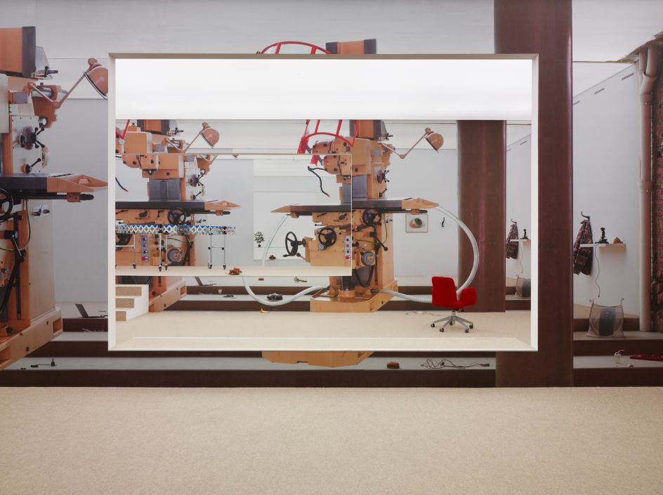 The room suddenly appears to double in size, and more objects appear, including a gargantuan-sized coffee machine. A visual game unfolds as the objects in real space match or don’t match their ‘reflections’ in the wall-based composition that has undergone extensive post-production. A slightly sinister narrative also takes shape as the demands of contemporary work culture are signalled through the inclusion of decorations, camp beds and litter.